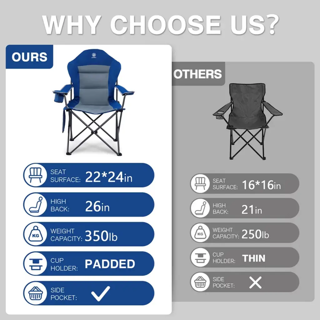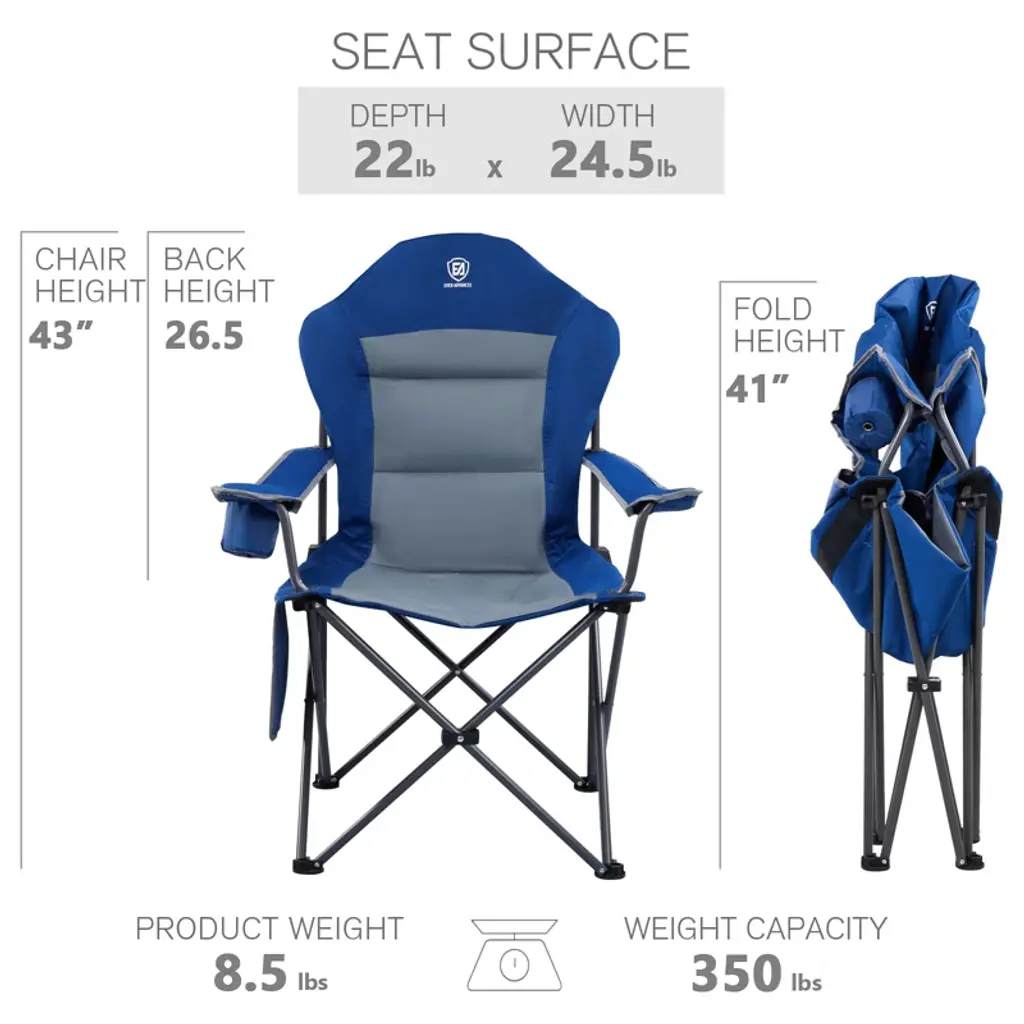 OVERSIZED PORTABLE CHAIR: This folding camping chair is large in size and designed to be portable (set size: 22 x 24 x 43 inches; folding size: 8.5 x 8.5 x 41 inches; weight only 8.5 lbs), not only meeting the needs of different groups of people, but also easy to carry. (Comes with a free carry bag) COMFY & HEAVY DUTY: This outdoor folding chair weighs 350 lbs and is suitable for people of all body types. It's friendly to big people. Padded fabric and a high back will keep you comfortable even after sitting for hours. Thickened armrests are adjustable to fit your arms. DURABLE AND STRONG: This folding lawn chair is reliable and durable than most cheap one. It consists of strong steel pipes, 600 D polyester fabric, stable legs, and a scientifically designed structure. PRACTICAL STORAGE FUNCTION: Thick foam cup holder allows you to enjoy cold or hot drinks at will. The side pocket can hold mobile phones, keys, or snacks. MULTIPLE SCENARIOS: This portable folding chair is an ideal choice for camping, backyard, beach, lawn, RV travel, and more. It is the best gift to give to parents or friends. With this chair, you will enjoy leisurely and enjoyable outdoor time with friends, family, and partners.All EVER ADVANCED products have a 1-year manufacturer's after-sales protection. Please feel free to contact us if you need any supports.OVERSIZED PORTABLE CHAIR: This folding camping chair is large in size and designed to be portable (set size: 22 x 24 x 43 inches; folding size: 8.5 x 8.5 x 41 inches; weight only 8.5 lbs), not only meeting the needs of different groups of people, but also easy to carry. (Comes with a free carry bag) COMFY & HEAVY DUTY: This outdoor folding chair weighs 350 lbs and is suitable for people of all body types. It's friendly to big people. Padded fabric and high back will keep you comfy even after sitting for hours; Thickened armrests are adjustable to fit your arms. DURABLE AND STRONG: This folding lawn chair is reliable and durable than most cheap one. It consists of strong steel pipes, 600 D polyester fabric, stable legs, and a scientifically designed structure. PRACTICAL STORAGE FUNCTION: Thick foam cup holder allows you to enjoy cold or hot drinks at will. The side pocket can hold mobile phones, keys, or snacks. MULTIPLE SCENARIOS: This portable folding chair is an ideal choice for camping, backyard, beach, lawn, RV travel, and more. It is the best gift to give to parents or friends. With this chair, you will enjoy leisurely and enjoyable outdoor time with friends, family, and partners. All EVER ADVANCED products have a 1-year manufacturer's after-sales protection. Please feel free to contact us if you need any support.