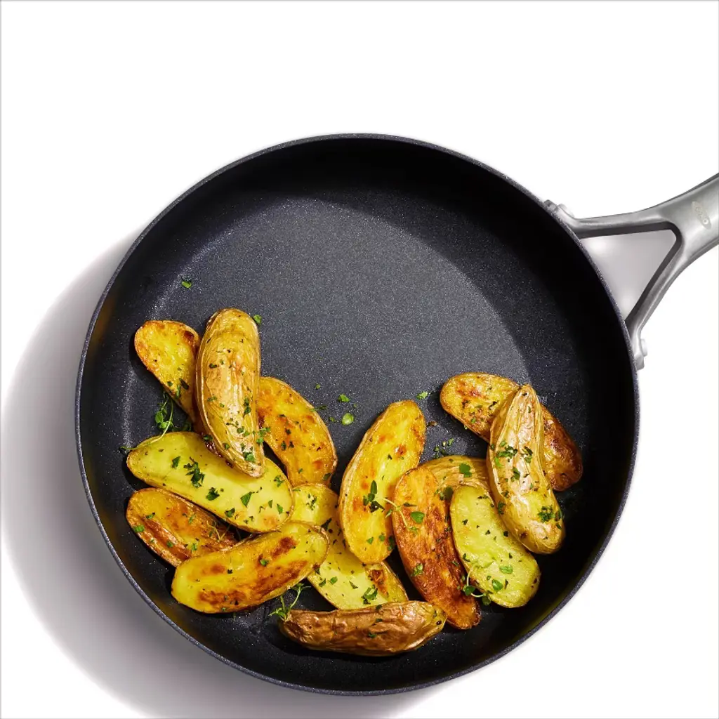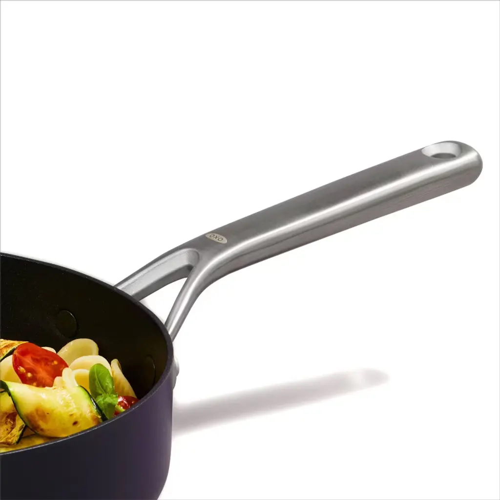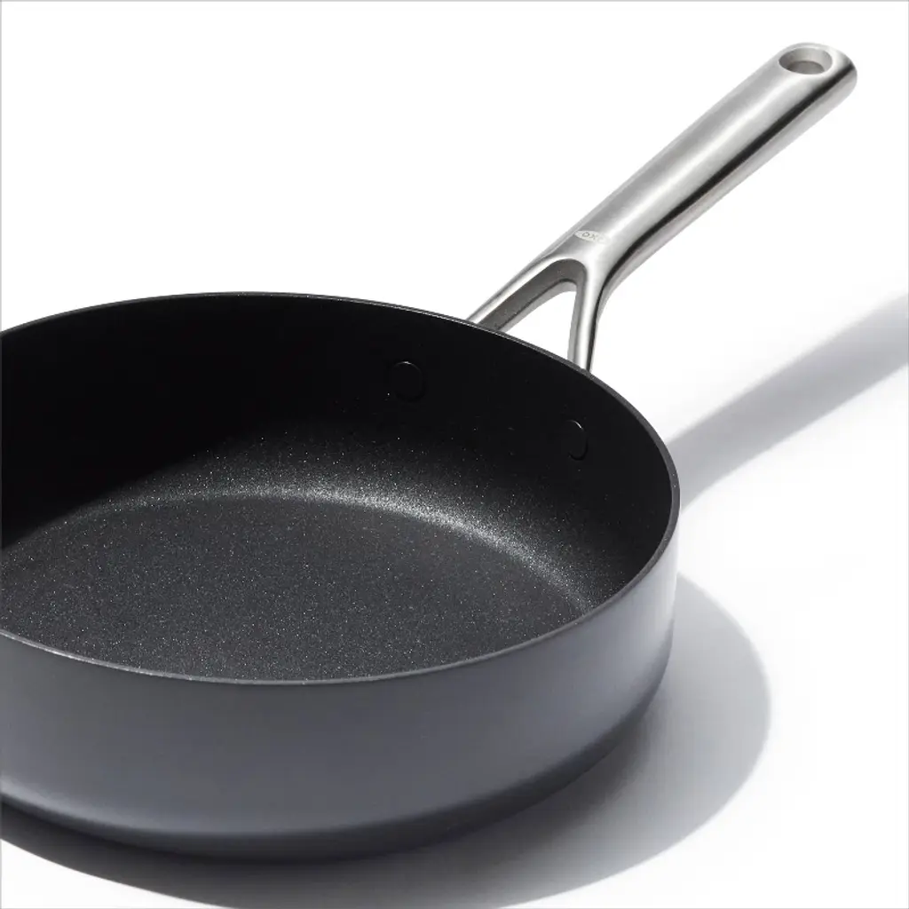 Get more room and better performance with the OXO Ceramic Professional Non-Stick 3-Quart Sauté Pan with Lid. This pan features a diamond-reinforced ceramic non-stick coating that delivers effortless food release with less oil. Cleanup is easy, plus our ceramic non-stick coating is free of PFAS, PFOA, lead and cadmium. This pan’s scratch-resistant, hard-anodized aluminum body heats faster and more evenly than traditional aluminum, and the tempered glass lid lets you keep an eye on your meal without losing heat. Optimized for any kitchen, this pan has heavy-duty induction base that works on every stovetop and it’s dishwasher safe.