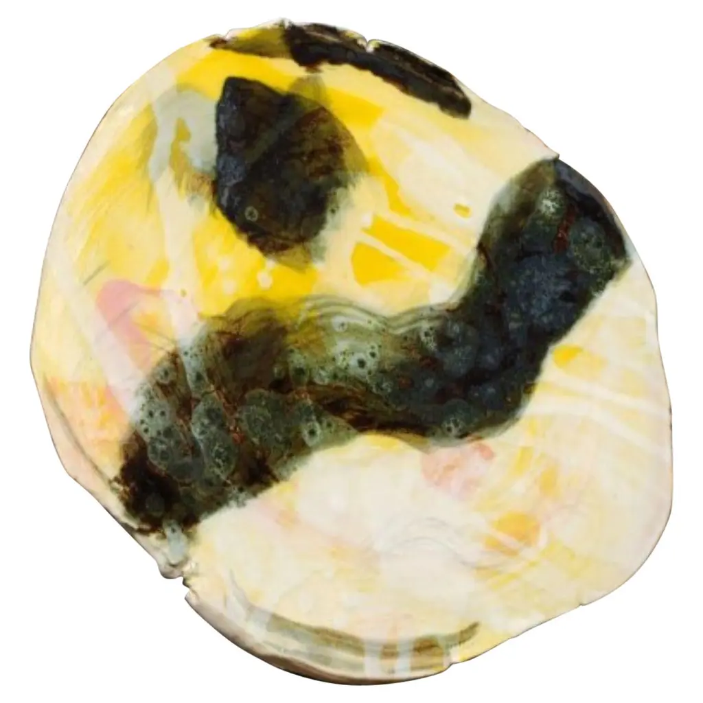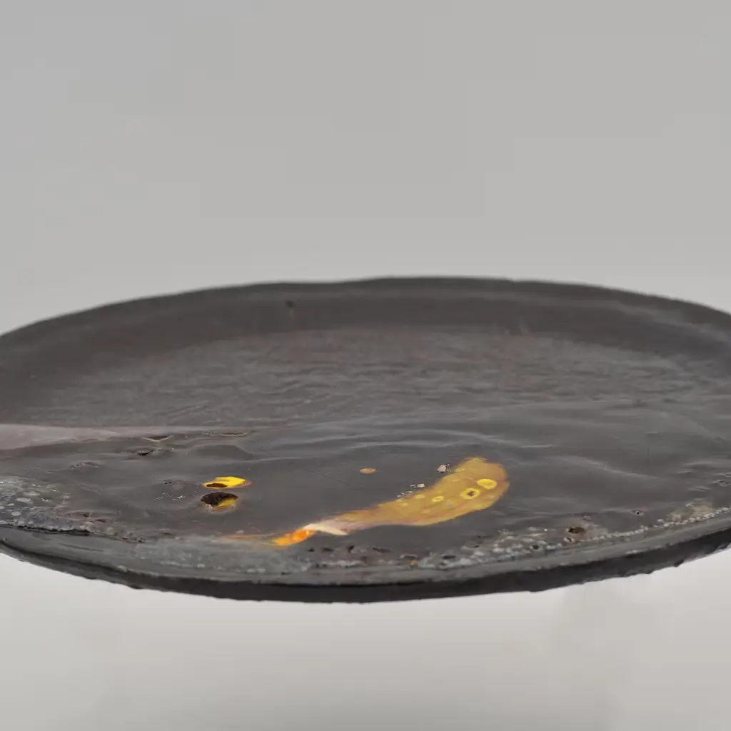 A deft showcase of craftsmanship, this round decorative plate is fashioned using an intriguing and dynamic combination of materials. Created in 1981 along with a twin design obtained with a gypsum mold, it is made of single-firing clay enriched with melted colored glass revealing an impressive yet delicate burst of yellow hue. The black ceramic surface is completed with graphic decorations.