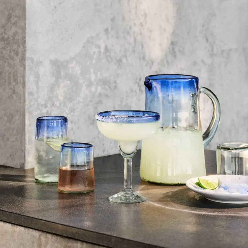 Our Pacifico pitcher infuses Passion Fruit Sangria, Rum Punch and jalapeño lemonade with serious beach vacation vibes. Crafted of softly rounded glass, the softly rounded vessel flows from ocean blue on the rim to sea-glass green at the base. Generous proportions hold plenty of your favorite cocktail, mocktail or seltzer. To recreate the swim-up bar mood at home, pair the cocktail glass with the other blue-rim pieces in our exclusive Pacifico glassware collection.