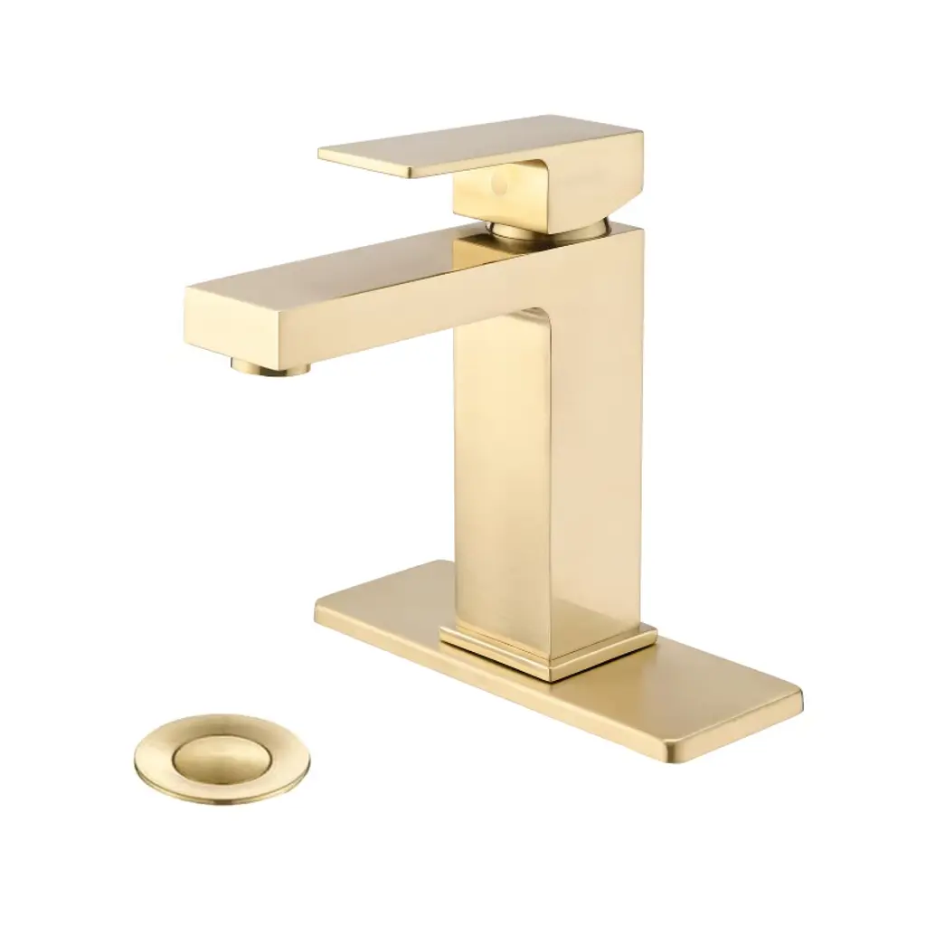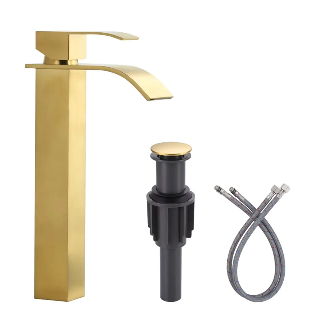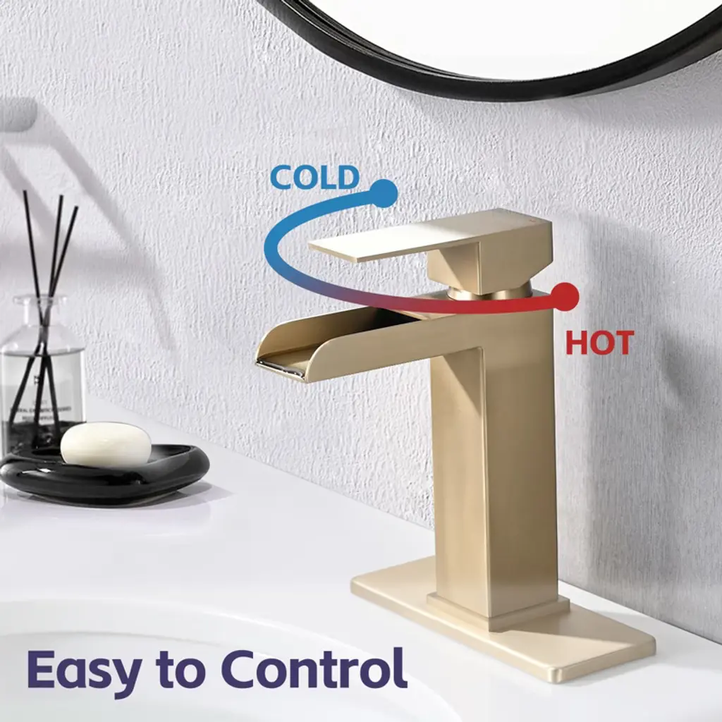 Paged Waterfal Bathroom Faucets Single Handle Bathroom Sink Faucet Modern Vanity Basin Faucet With Deck Plate & Overflow Pop Up Drain, Brushed Gold