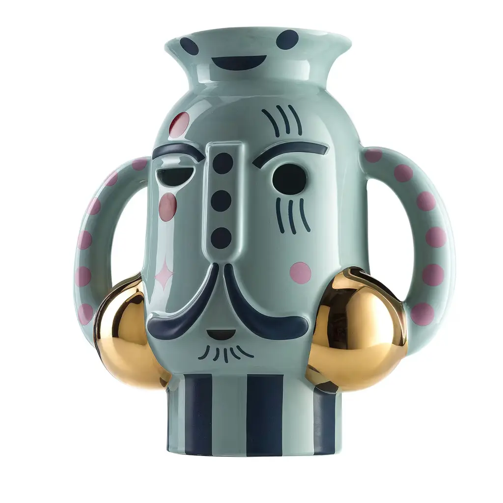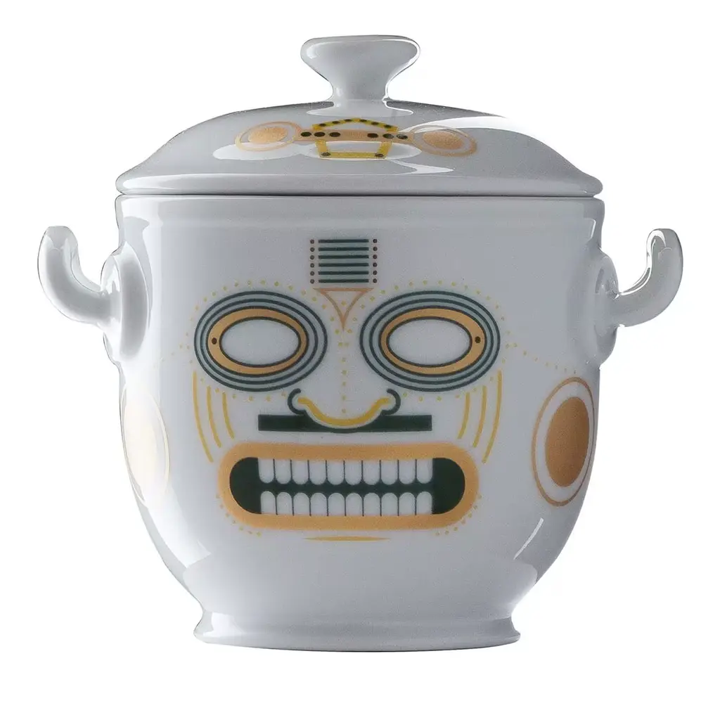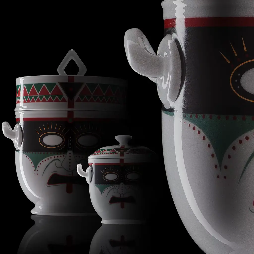 Based on the original "rinfrescatoio" by Geminiano Cozzi intended to keep fruit and other foods fresh on the table, this refined piece is composed by two stacked pieces: a top lid and the actual ice bucket with handles. Part of the collection Ethnics, designed by Gianpiero Mastro, this piece is inspired by the ancient masks of different cultures. Behind it there is a careful research of colours and stylistic elements, according to the canons of Geminiano Cozzi who creates a marriage between the ancient Venetian tradition of porcelain and the cultures of this increasingly global world accompanying the "rinfrescatoio" in a path that transforms it into an object of cult and collection.