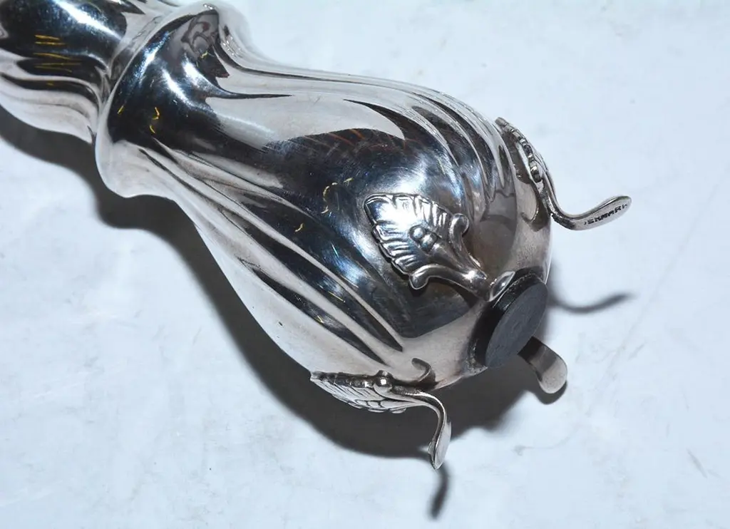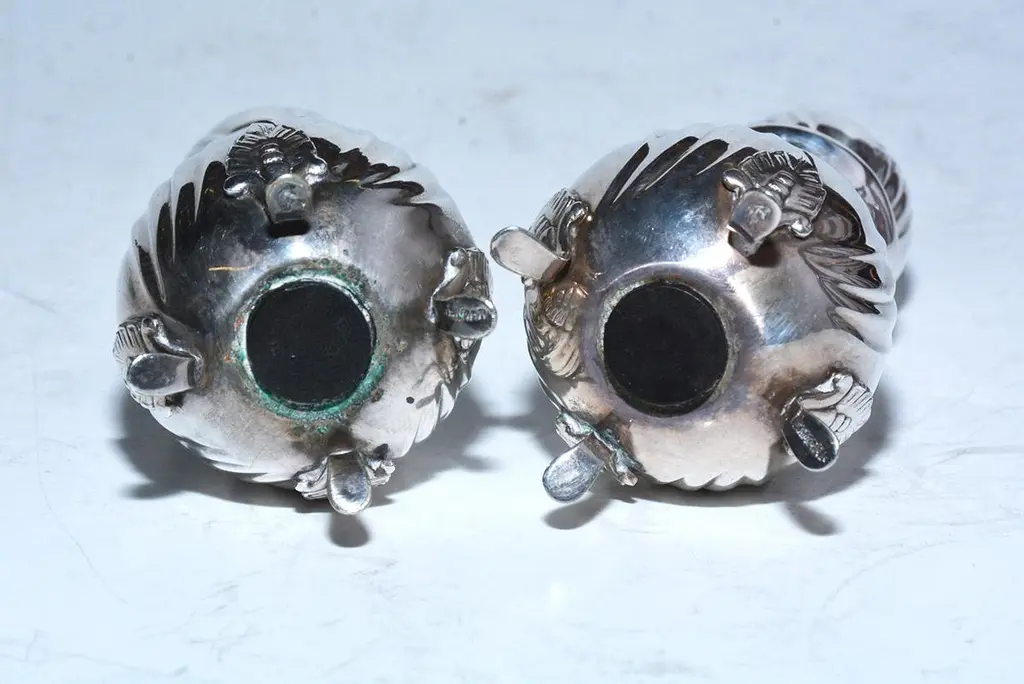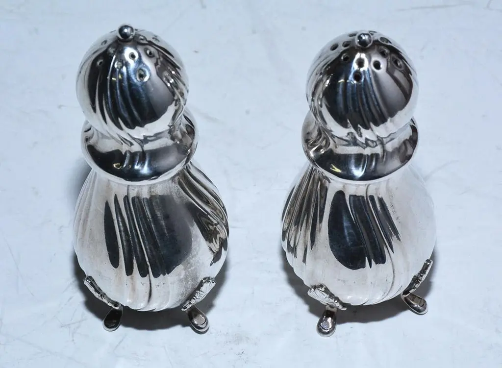 Each of the neoclassical pair of 20th century Danish silver plated salt shakers stand on four acanthus-leafed feet. The surfaces are embellished with undulating ribbing. The bottoms have plugged openings. On the bottom of one foot of each Shaker is stamped "Denmark." On the second foot of each is stamped the symbol of a fish with its tail flipped upwards.OFFERING FREE SHIPPING TO CONTINENTAL US. PLEASE JUST ASK FOR A SHIPPING QUOTE.