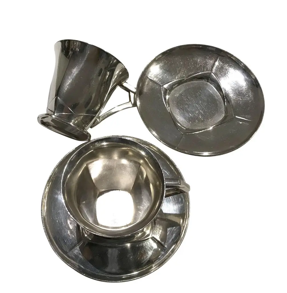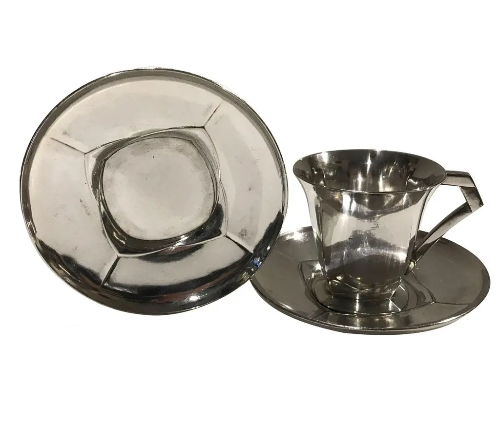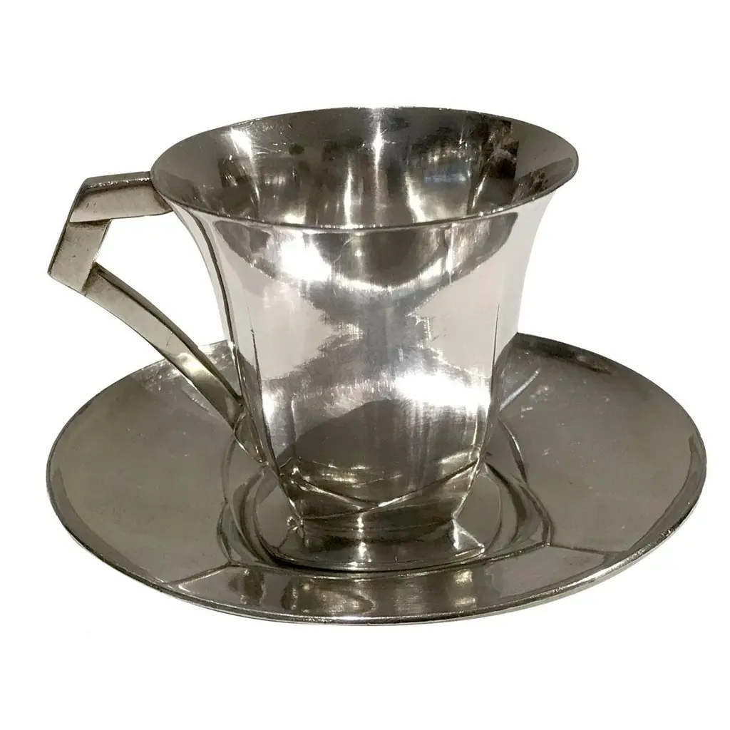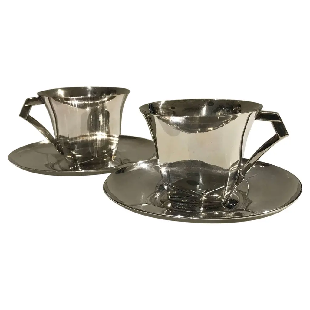 Pair of Art Deco Coffee Cups sold with their saucers. Designed by Louis Süe ( 1875-1968) & André Mare (1887-1932) for Gallia - Christofle. Silverplated with plant motifs in low-relief.Stamped underneath "Gallia", and "OC" for Christofle and numbered with the number of the model 5968.Dimensions : Cup : height 6,6 cm x diameter 6,8 cm x depth 9 cmSaucer : diameter: 11,5 cm Louis Süe (1875-1968) was an architect, painter, and designer among the best representatives of the Art Deco style in France. He founded, with the also painter and architect André Mare (1887-1932), the Compagnie des arts français in 1919 and they produced furniture together. Recognized designers and many times awarded for their projects, Süe and Mare participated in many shows and Great Exhibitions and were active in the core of societies such as the Société des Artistes Décorateurs (SAD). They also collaborated with huge companies, such as Gallia for the world-renowned silversmith Christofle. Part of their work is exhibited in "The Art Décoratif Museum" of Paris.
