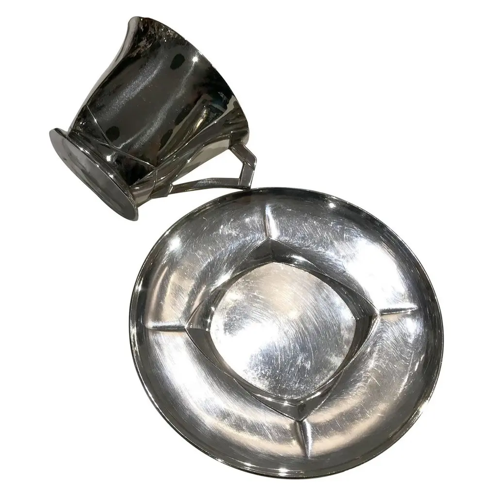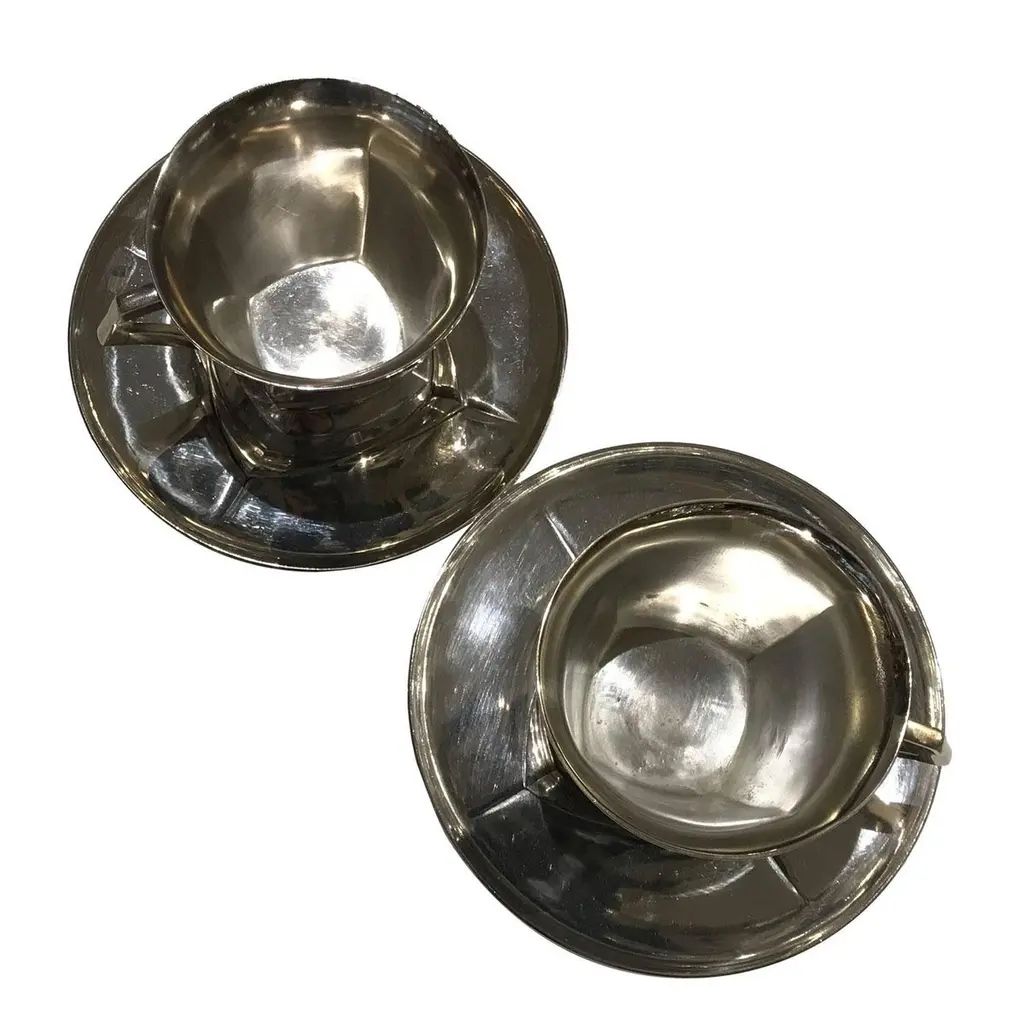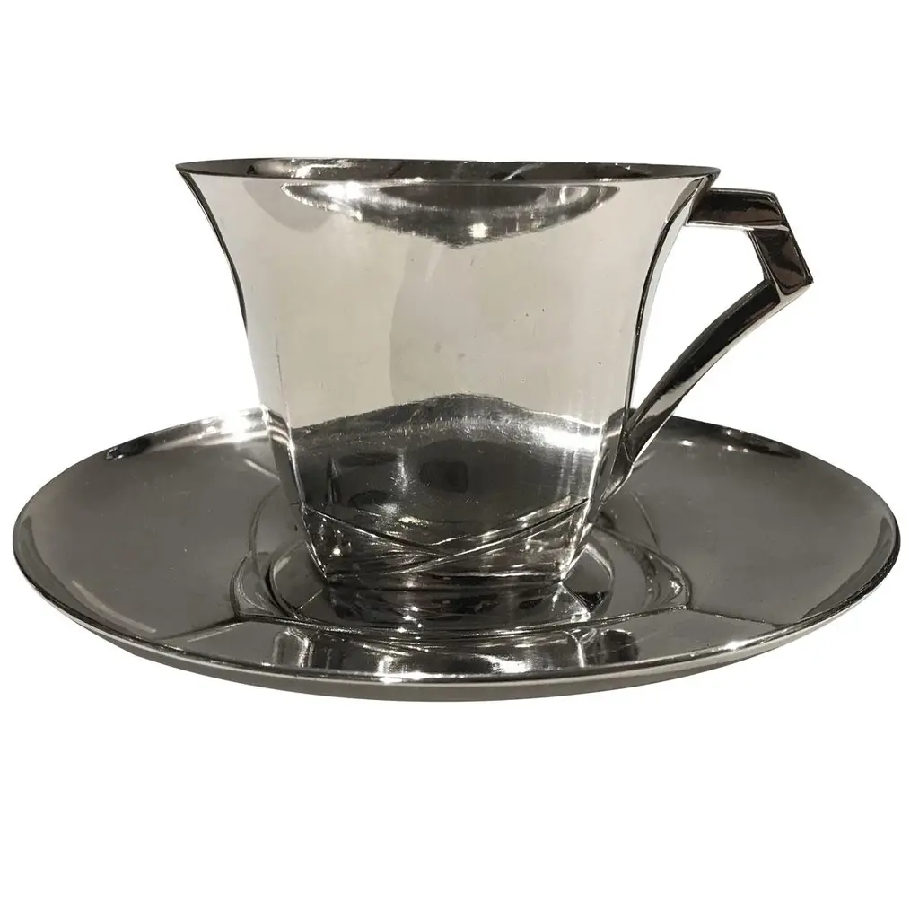 Pair of Art Deco tea cups sold with their saucers. Made by Louis Süe (1875-1968) & André Mare (1887-1932) for Gallia - Christofle. Silverplated with plant motifs in low-relief.Stamped underneath "Gallia", and "OC" for Christofle and numbered with the number of the model 5967.Dimensions : cup : height 7 cm x diameter 8,2 cm x depth 10 cmSaucer: diameter: 14 cm Louis Süe (1875-1968) was an architect, painter, and designer among the best representatives of the Art Deco style in France. He founded, with the also painter and architect André Mare (1887-1932), the Compagnie des arts français in 1919 and they produced furniture together. Recognized designers and many times awarded for their projects, Süe and Mare participated in many shows and Great Exhibitions and were active in the core of societies such as the Société des Artistes Décorateurs (SAD). They also collaborated with huge companies, such as Gallia for the world-renowned silversmith Christofle.