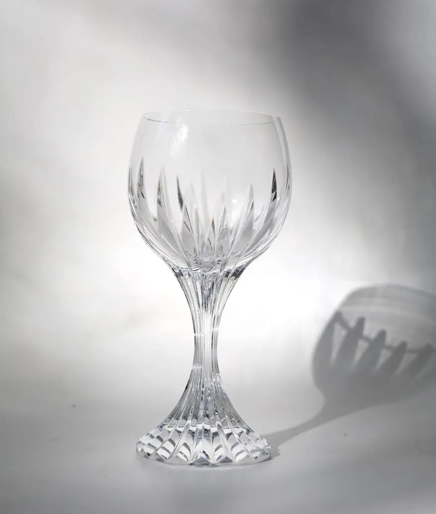 The Massena glass showcases Baccarat’s meticulous craftsmanship. Deep orgue bevel cuts are etched directly into the Clear crystal, radiating from the foot of the glass to the base of the wide bowl. This, in turn, puts the smoothness of the upper bowl in sharp relief. The intricate detailing gives the Massena glass the appearance of impressive heft, as if it were a modern-day chalice. The polished silhouette and prismatic qualities make it worthy of any festive occasion or special soirée. The glass is just one component of the iconic Massena bar and tableware collection, which encompasses wine glasses, highball glasses, tumblers, and a decanter. All pieces from the Massena collection share a scrupulously textural quality.