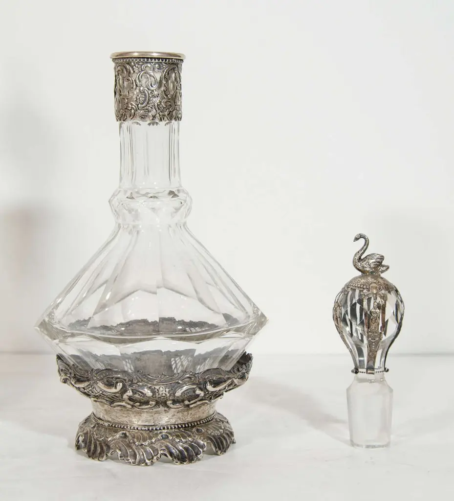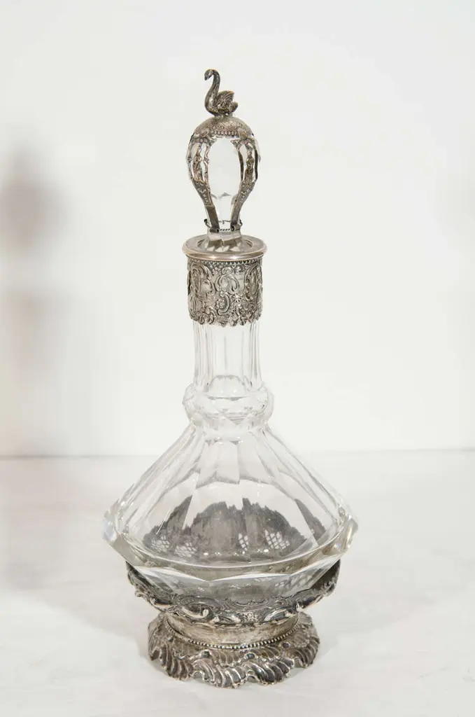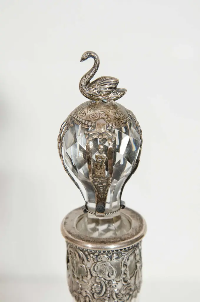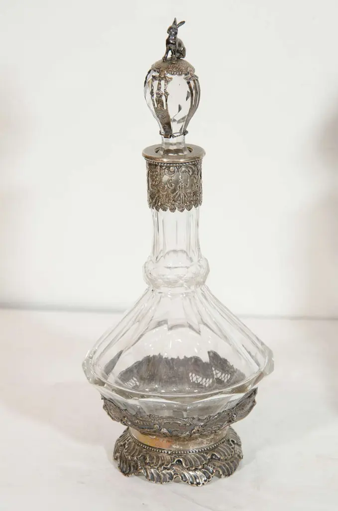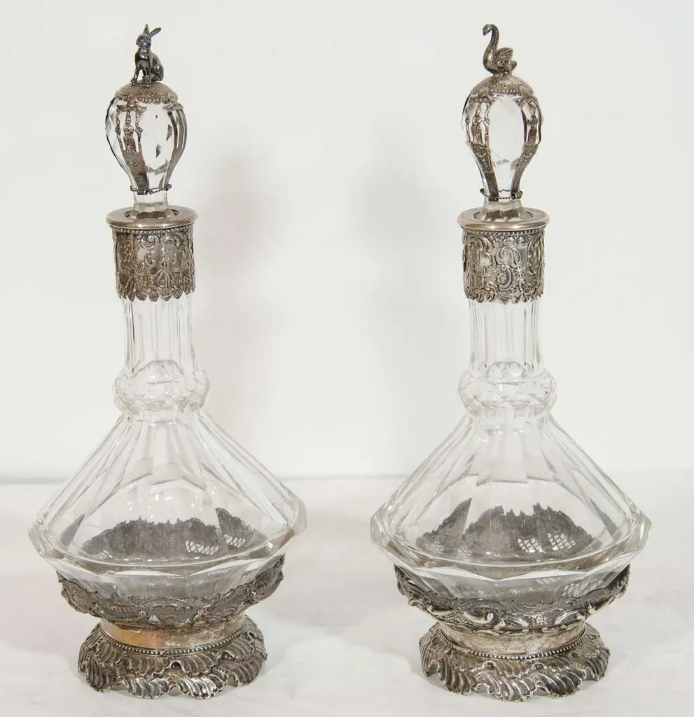 A spectacular pair of fine antique German silver and cut crystal decanters. Each decanter is formed with a broad, faceted body rising to a tall, narrow neck and is mounted with chased silver collars and footed bases. The crystal bodies are cut with angular facets that catch the light and taper smoothly into the necks. The silver mounts at the base feature scrolling acanthus leaves and floral patterns in relief, bordered with beaded rims. The neck mounts display repoussé floral scrollwork and stylized foliage, providing a richly ornamented contrast to the clear faceted crystal.The stoppers are especially distinctive, composed of faceted crystal enclosed within pierced silver mounts surmounted by animal finials. One stopper is crowned by a swan, its wings partially spread, while the other is topped with a hare seated upright. The silver cages surrounding the crystal stoppers are decorated with small relief figures and ornamental scrolls, forming a framework that secures the cut crystal element beneath the animal finials. The combination of figural silverwork and crystal cutting reflects the elaborate detailing characteristic of German silver-mounted wares.These decanters were produced in Germany, where silver and crystal-mounted tablewares were a hallmark of 19th-century decorative arts. German silversmiths and glassmakers frequently collaborated, combining high-quality cut crystal with chased and repoussé silver mounts. The intricate mounts and figural finials indicate work by skilled German workshops known for their decorative silver objects intended for both functional and display purposes. The use of animal finials, such as the hare and swan, reflects a taste for naturalistic and symbolic motifs within German silver design of the period.