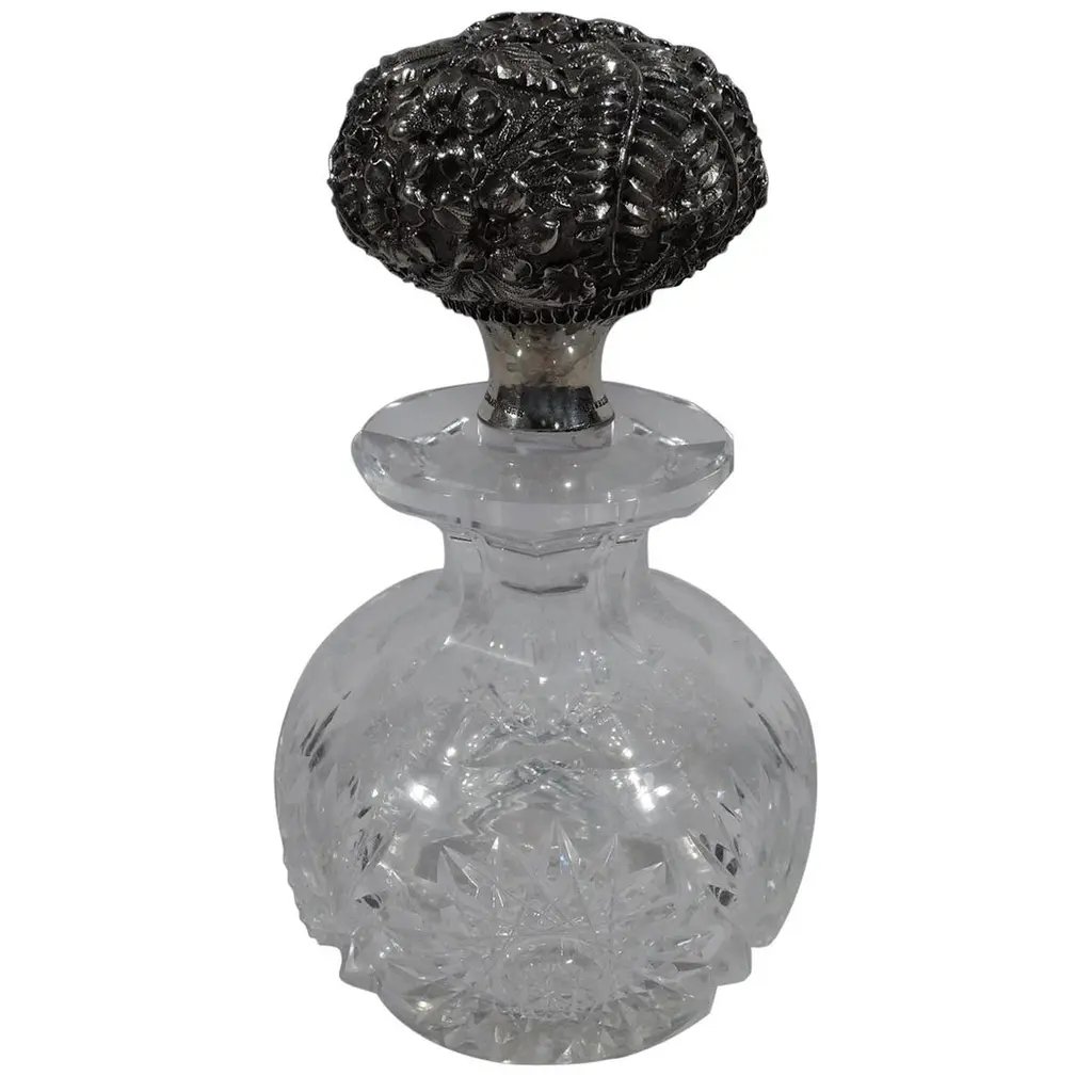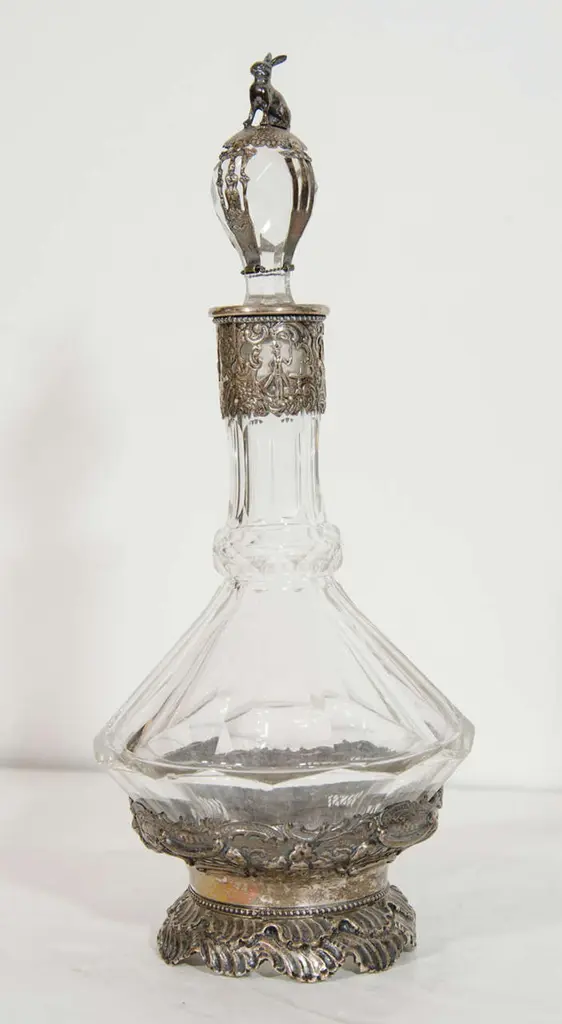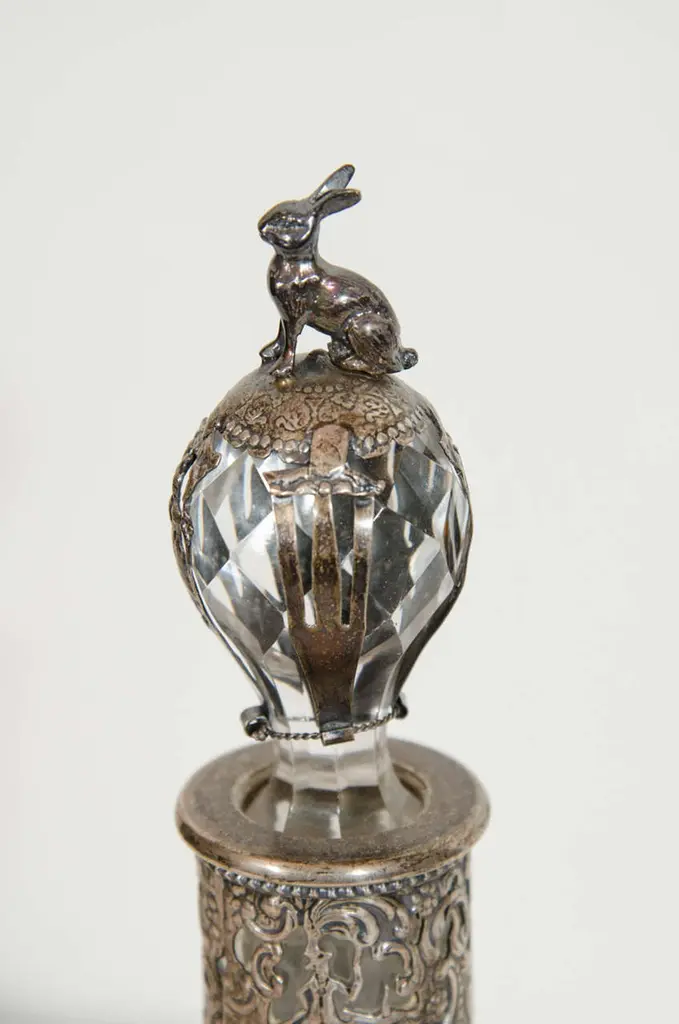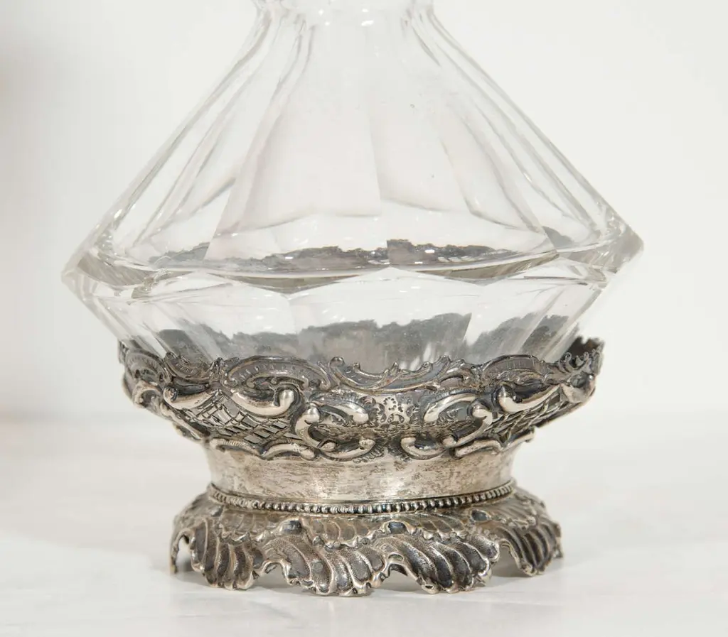 A spectacular pair of fine antique German silver and cut crystal decanters. Each decanter is formed with a broad, faceted body rising to a tall, narrow neck and is mounted with chased silver collars and footed bases. The crystal bodies are cut with angular facets that catch the light and taper smoothly into the necks. The silver mounts at the base feature scrolling acanthus leaves and floral patterns in relief, bordered with beaded rims. The neck mounts display repoussé floral scrollwork and stylized foliage, providing a richly ornamented contrast to the clear faceted crystal.The stoppers are especially distinctive, composed of faceted crystal enclosed within pierced silver mounts surmounted by animal finials. One stopper is crowned by a swan, its wings partially spread, while the other is topped with a hare seated upright. The silver cages surrounding the crystal stoppers are decorated with small relief figures and ornamental scrolls, forming a framework that secures the cut crystal element beneath the animal finials. The combination of figural silverwork and crystal cutting reflects the elaborate detailing characteristic of German silver-mounted wares.These decanters were produced in Germany, where silver and crystal-mounted tablewares were a hallmark of 19th-century decorative arts. German silversmiths and glassmakers frequently collaborated, combining high-quality cut crystal with chased and repoussé silver mounts. The intricate mounts and figural finials indicate work by skilled German workshops known for their decorative silver objects intended for both functional and display purposes. The use of animal finials, such as the hare and swan, reflects a taste for naturalistic and symbolic motifs within German silver design of the period.