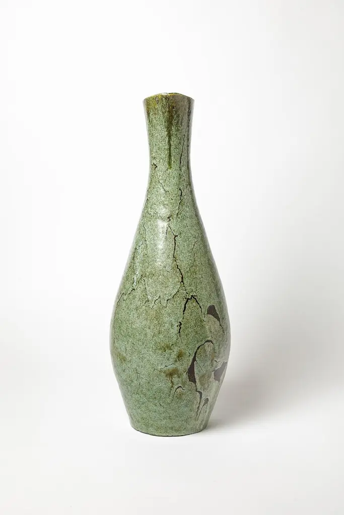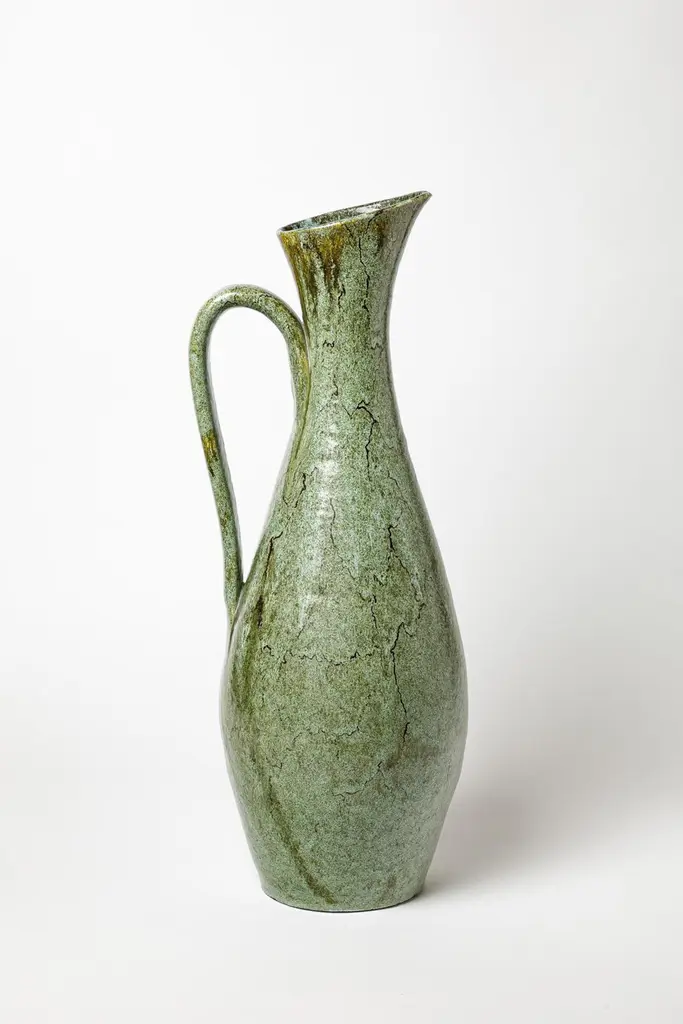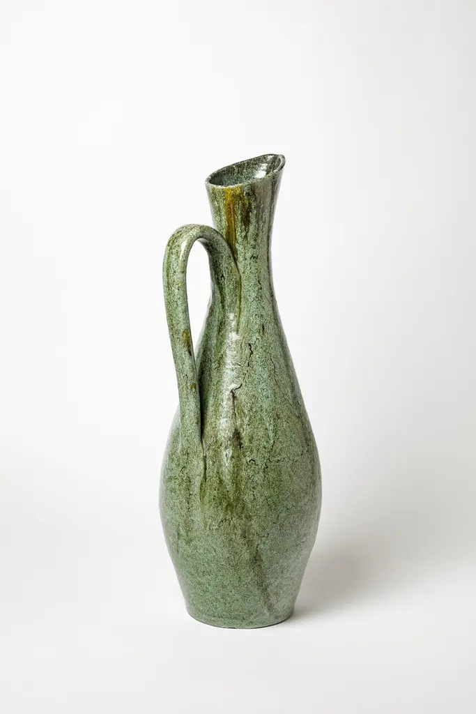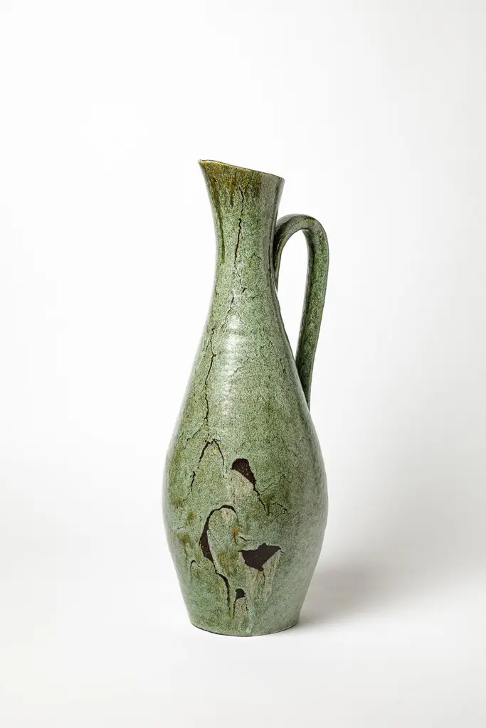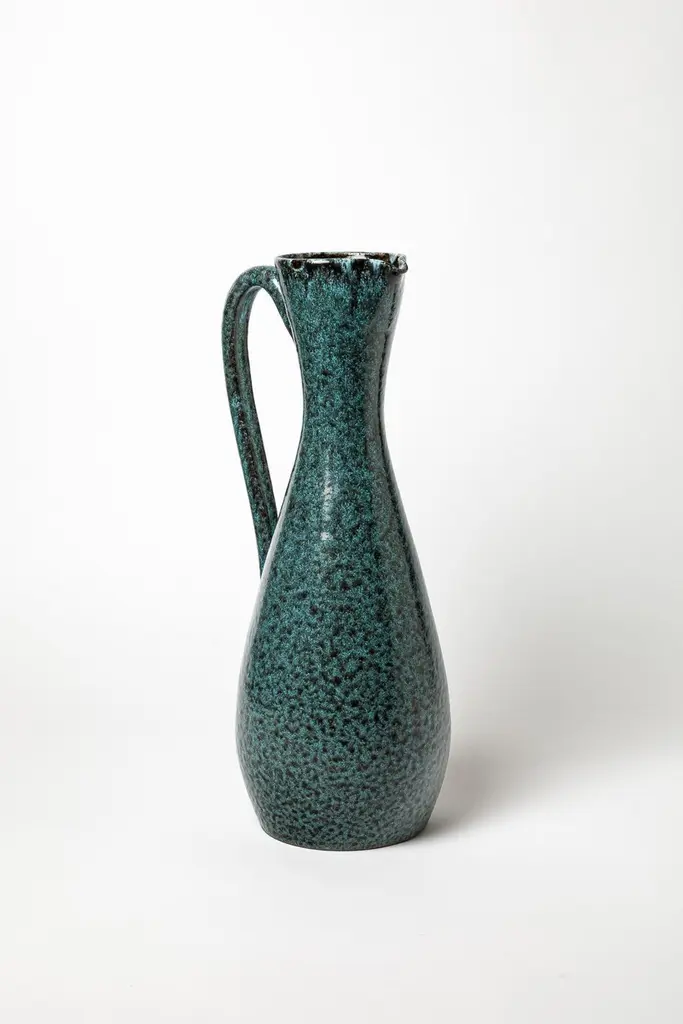 Pair of glazed ceramic pitchers by Accolay.Artist monogram under the base. Circa 1960-1970.H : 21.4 x 7.5 x 6.7 inches.H : 18.1 x 6.3 x 5.9 inches.