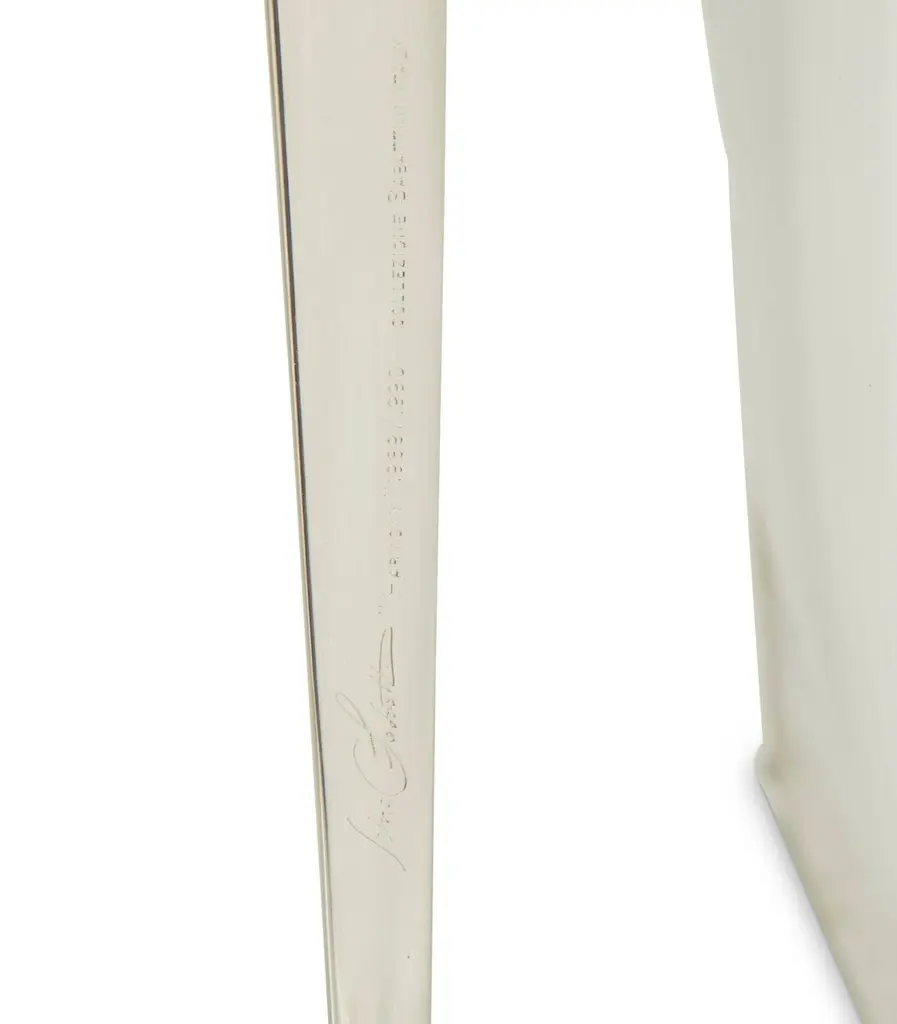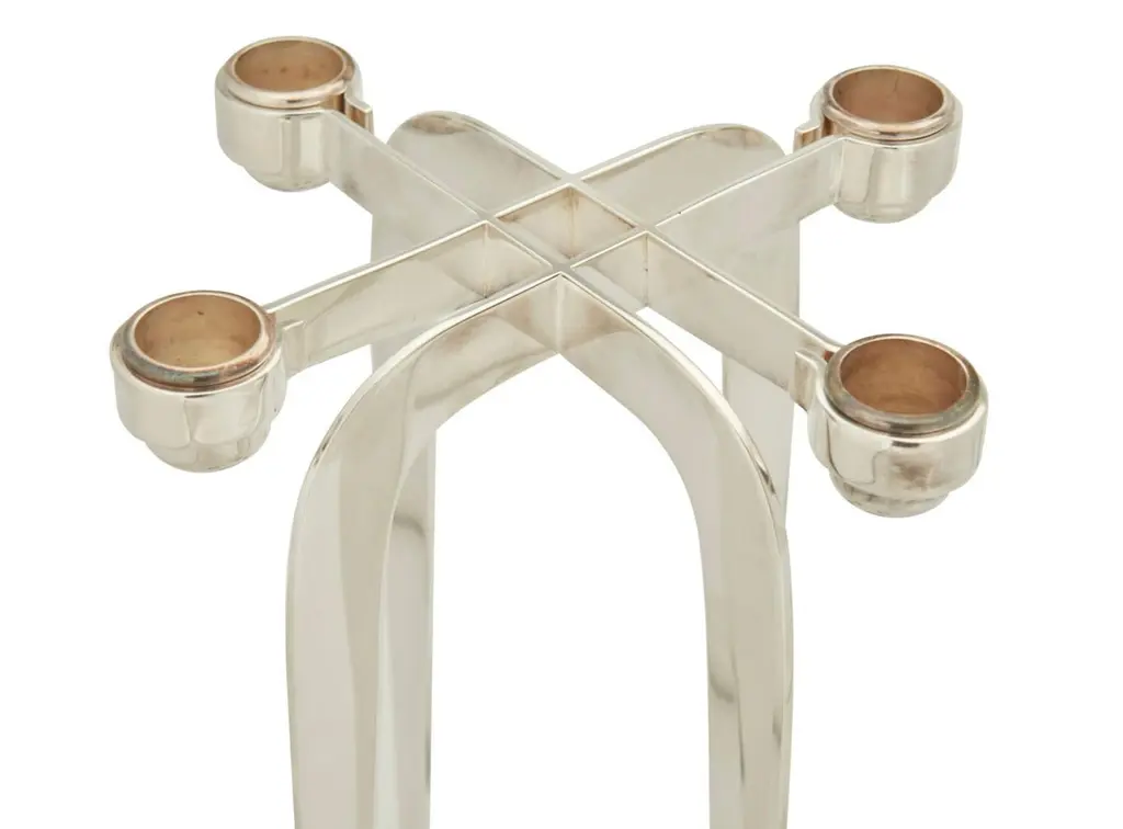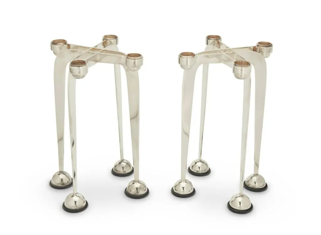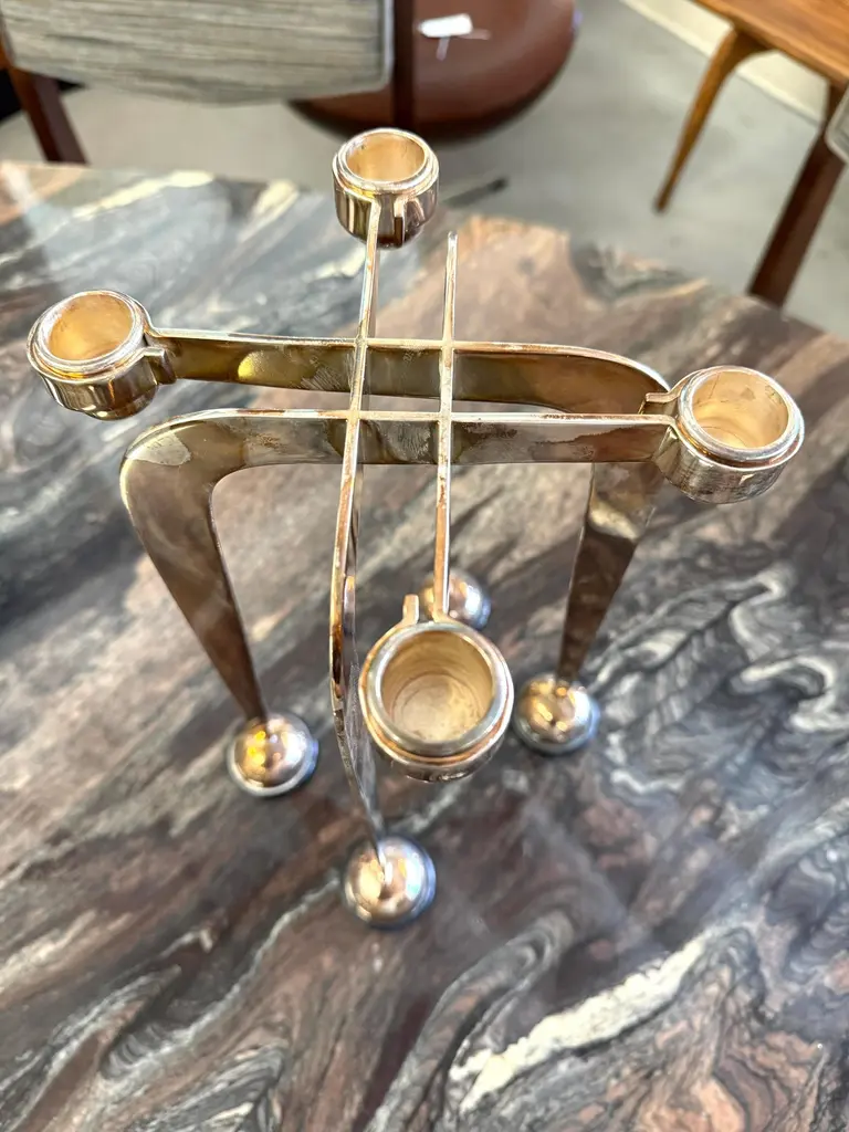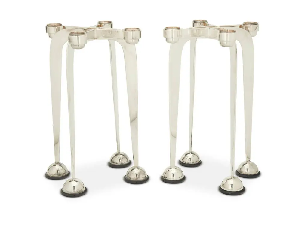 A beautiful pair of Lino Sabattini post modern silver plated candlesticks from his Harmony series of 1989/90. They are marked on the side of one upright. they each have four candleholders. An elegant design and unusual to find a pair intact. As with all silverplate these will likely need polishing after we ship them as the handling and packing will marks them with fingerprints. They are in good condition with minor surface scratches and minor imperfections.