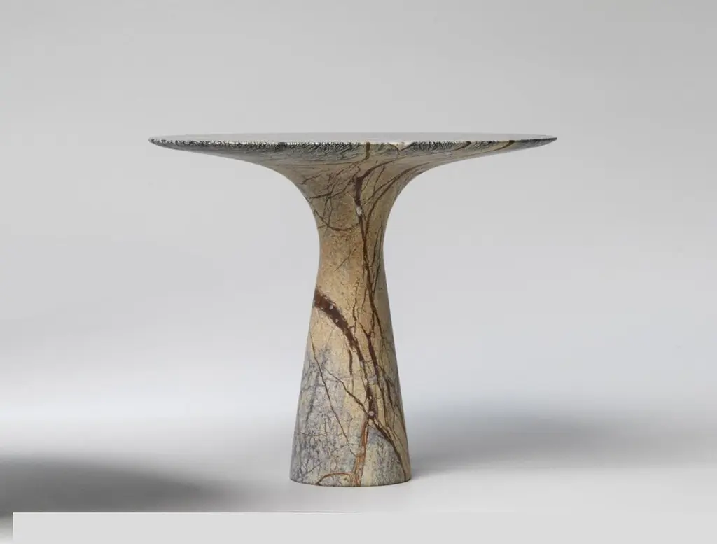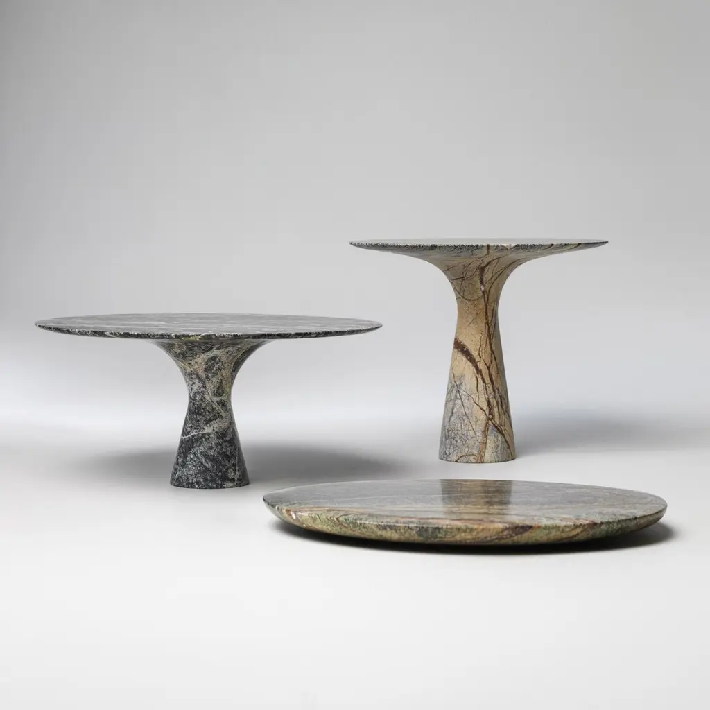 Pair of Refined Contemporary marble 03 Picasso green marble cake standsSigned by Leo Aerts.Dimensions: Diameter 26 x Height 22.5 cm Material: Picasso green marbleTechnique: Polished, carved. Available in marble: Kyknos, Bianco Statuarietto, Grey Saint Laurent, Picasso Green, Port Saint Laurent, Travertino Silver, Rosso Lepanto, or Travertino Rosso. Available in sizes Small or Medium. Also available in Sets. Angelo O is the brother and scale model of the natural stone table Angelo M. Angelo O can be ideally used as a cake dish or to serve other delicacies. The collection consists of three different models available in nine different marble types. Each object is completely hand-finished and is signed on the bottom. The slim base provides an elegant look and also promotes holding the object while serving.The objects have a honed, matte finish. Every Angelo O cake dish is packed in an original wooden gift box.A sculptural shape, robust material, elegant design, and a refined finish are the characteristics of Angelo O. The essence of each piece is defined by design, natural stone, and craftsmanship to meet the highest quality requirements. Angelo O2 is the little brother and scale model of the internationally award-winning Angelo M round table.Interior architect and designer Leo Aerts has run his own design agency Alinea for more than 30 years. The design has become part of his lifestyle. He swears by sober functional and timeless design that can be passed on from generation to generation. Neither Leo nor his designs can be categorized easily. The leitmotif? Durable materials are full of character. According to Leo, quality should always take precedence over quantity. His designs have repeatedly received national and international awards and accolades, including the coveted German Red Dot Award as well as the German Design Award, the Good Design Award in Chicago, and the AZ Award in Toronto.