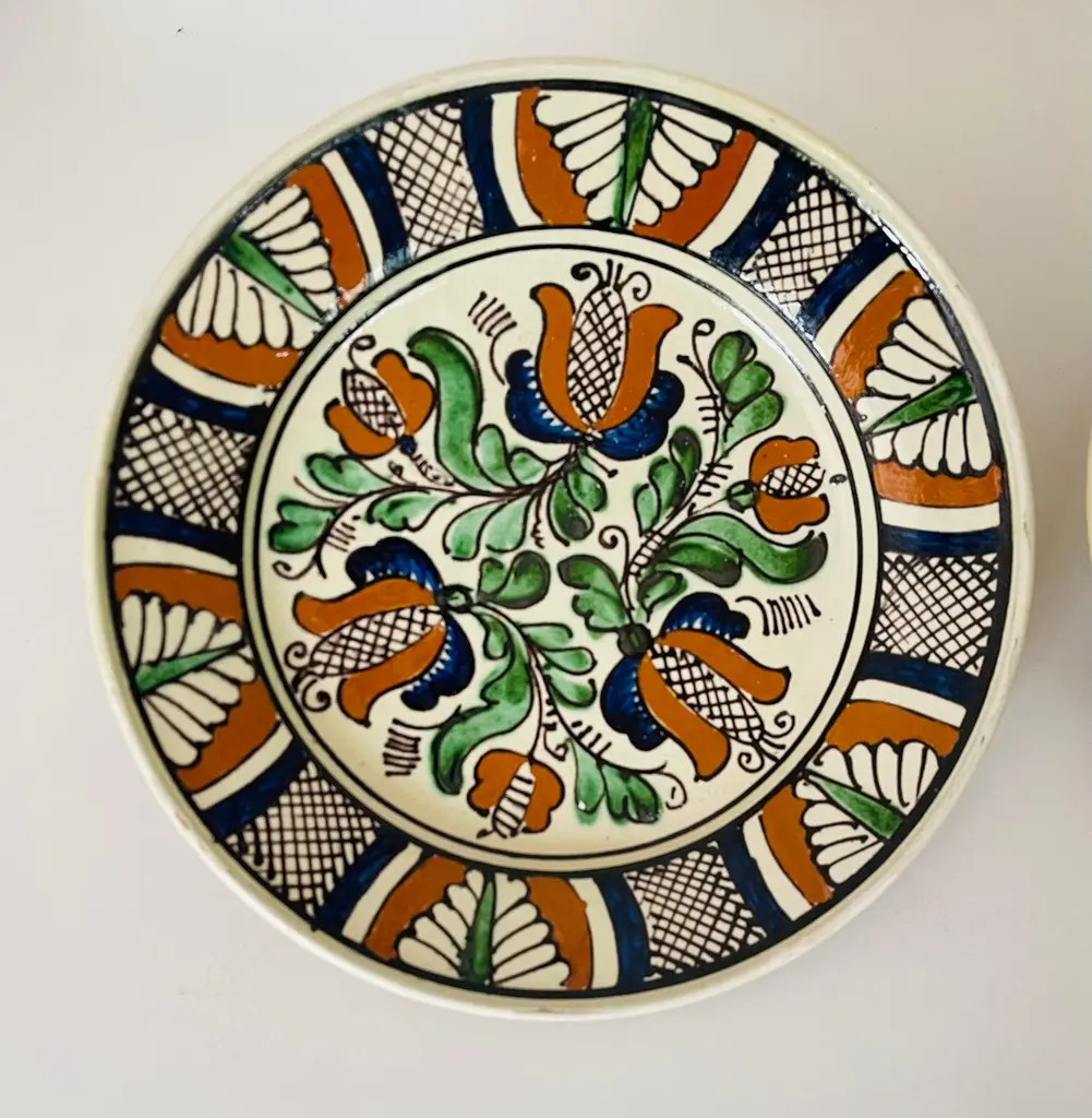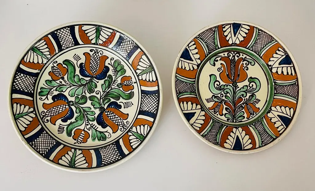 Pair of Spanish folk art glazed ceramic polychrome hand painted plates, 11” and 10” each. Signed verso.
