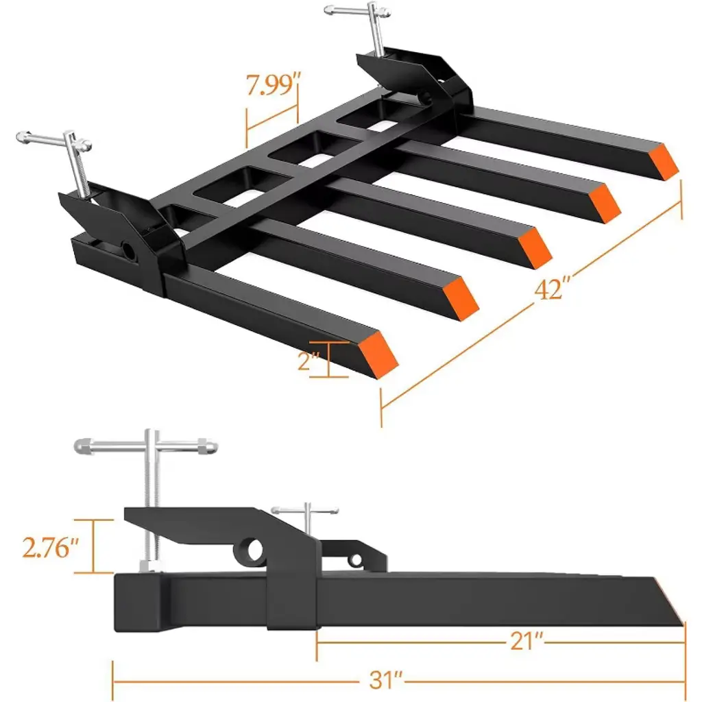 1.2500 Lbs Capacity with Reinforced Durability Built to handle heavy loads, these clamp-on debris forks boast a 2500 lbs weight capacity, ensuring reliable performance for hauling bulky items without risk of breakage. Constructed with 30% thicker screws for ultra-secure fixing and 40% heavy-duty thick rectangular tube walls, the forks resist deformation and withstand years of rigorous use¡ªfrom daily farm chores to industrial °áÔË. The 5 sturdy tines add extra stability, making them ideal for lifting and moving heavy cargo with confidence. 2.Perfect Fit for 48" Buckets & Wide CompatibilityDesigned specifically as clamp-on debris forks for 48" buckets, these tractor forks seamlessly integrate with most slide loaders, skid steers, and tractors. Their dimensions are engineered to match standard equipment sizes, ensuring a snug, secure fit without modifications. Whether you¡¯re using a compact tractor or a full-size loader, these forks attach effortlessly, making them a versatile addition to your machinery fleet. 3.Tool-Free, Quick InstallationInstalling these tractor attachments is hassle-free: simply slide the forks onto the bucket¡¯s blade, rotate to clamp, and lock into place. No special tools or complex adjustments are needed, and the included clear, detailed instructions guide you through the process in minutes. This time-saving design means you spend less time setting up and more time getting work done¡ªperfect for busy farms, construction sites, or warehouses. 4.Multi-Scenario Versatility for All TasksThese pallet forks shine in diverse environments: from farms (hauling firewood, hay bales, or livestock feed) to factories (moving crates, pallets, or heavy parts), and construction sites (transporting lumber, bricks, or debris). They¡¯re also ideal for clearing lawn debris, relocating equipment, or organizing warehouse stock¡ªproving indispensable for any task that requires lifting and moving heavy loads efficiently. 5.Robust Specifications for Reliable PerformanceMeasuring 42" x 31" overall, these heavy-duty forks feature 5 sturdy tines that distribute weight evenly, preventing sagging or instability. The reinforced frame and thick-walled construction ensure long-term durability, even under frequent use in tough conditions. Whether you¡¯re a professional operator or a DIY enthusiast, these forks deliver consistent, dependable performance to tackle your toughest hauling jobs.