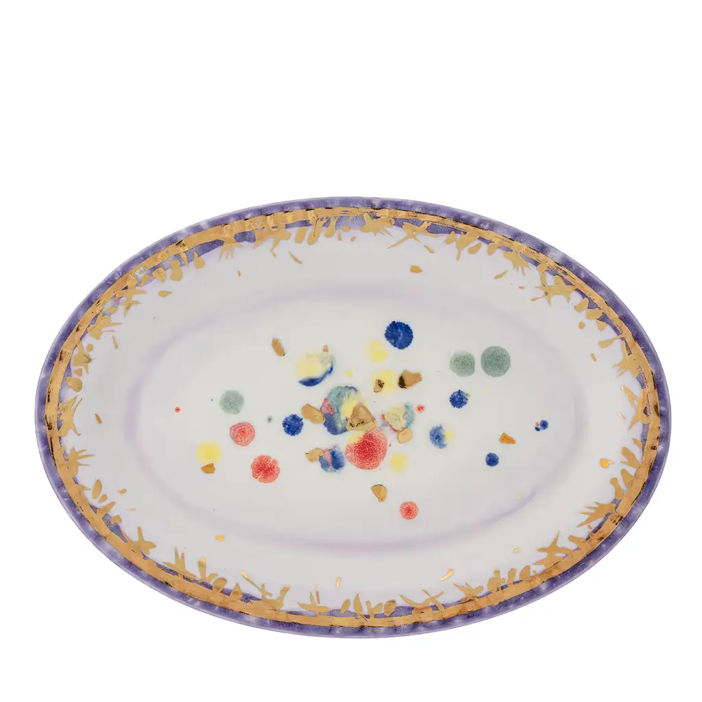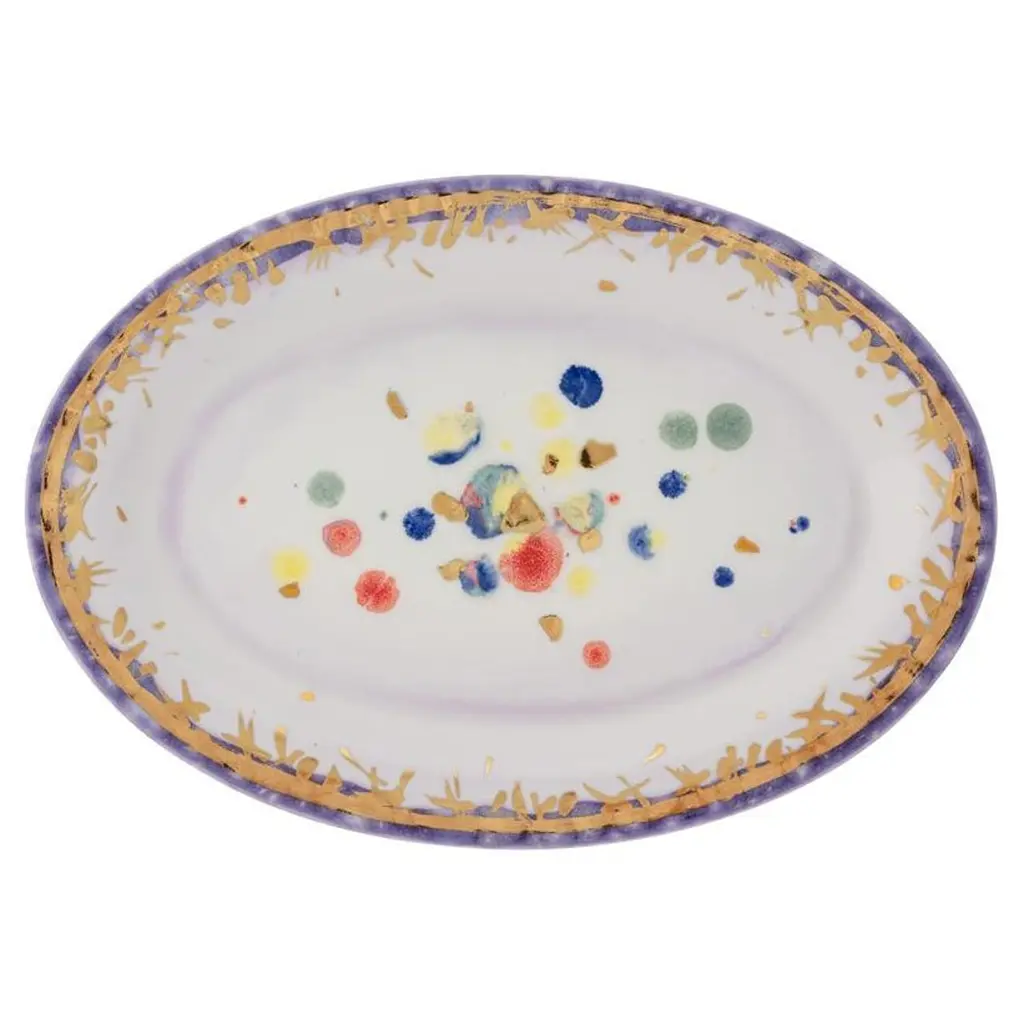 The Palm Beach Platter from the Florida collection is a stunning blend of luxury and cheer, launched in 2023. Inspired by the vibrant spirit of Florida, this bowl features a radiant Palm Beach pink that evokes the beauty of its beaches and sunsets. Its lightly colored center is adorned with multicolor dots, adding a playful touch. The rim is elegantly decorated with golden leaves, enhancing its opulent appeal.