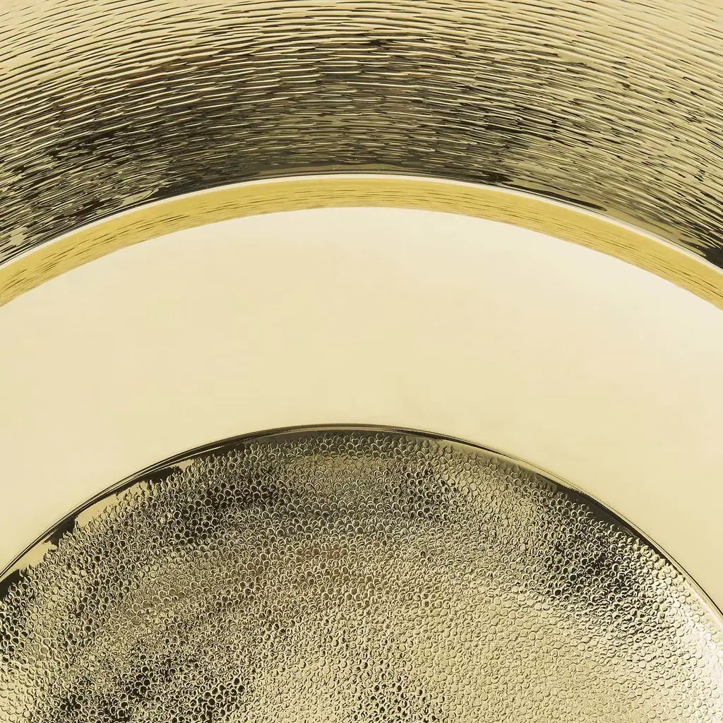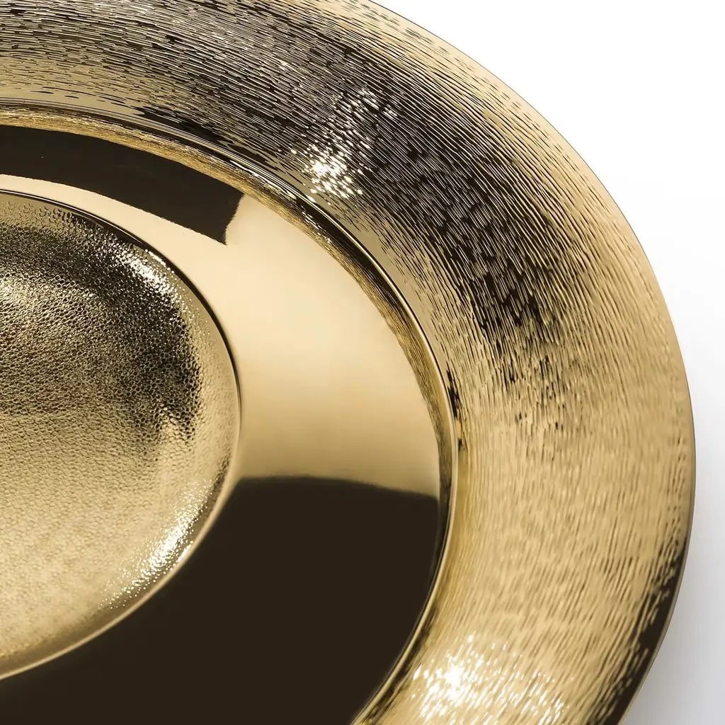 Crafted of brass with a gold-plating, this elegant bowl exemplifies traditional craftsmanship and innovative design aesthetic. The round plate features a flared rim sloping towards the center of the plate to create an undulating surface alternating between concave and convex sections. Each section boasts alternating textures, from smooth to brushed, and mirror. Named after Pantelleria, an island off the coast of Sicily, this luxurious plate is a timeless work of art that will enrich any decor. Available also silver-plated, please contact the Concierge. Part of a numbered series.