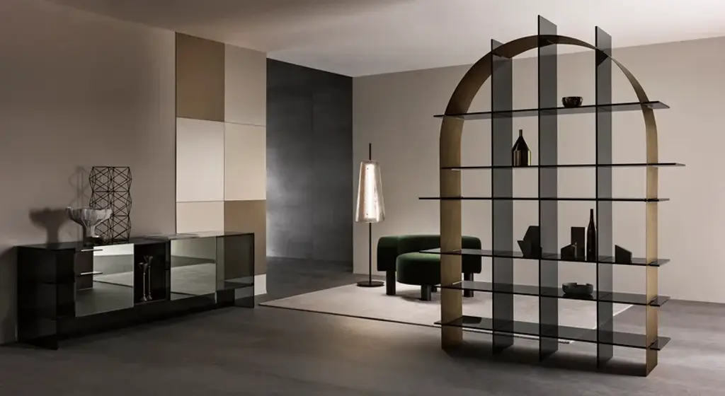Freestanding bookcase with extra clear or smoked glass structure.Interlocking geometric component made of thin metal sheet in the shape of an arch or circle in brushed bronze or brushed black finish.Created by the design and architecture studio Debonademeo Studio, the bookcase Paradigma is a freestanding furniture with glass structure in version extra clear or smoked. The geometric interlocking component of this designer bookcase is made with a thin metal sheet, bow shaped or round, in brushed bronze or brushed black finish and it is suitable even for the more luxurious environments.The vertical freestanding bookcase Paradigma was conceived to be included in living rooms or lounges, as well as studios. Its considerable height makes it perfect for vast environments and open spaces.