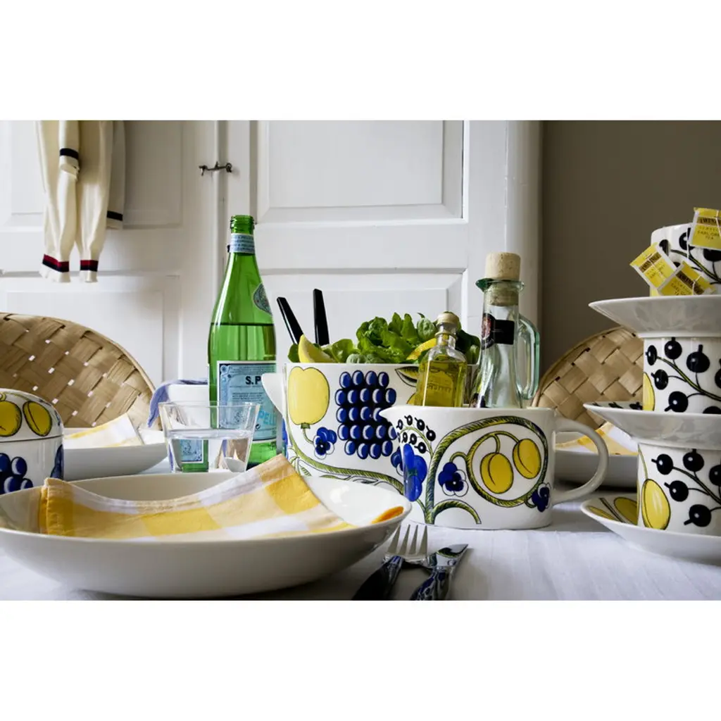 The Paratiisi cup by Arabia is adorned with Birger Kaipiainen's yellow-blue theme that gives a timeless, summery spirit for the abundant floral pattern. Arabia’s Paratiisi, Finnish for paradise, was designed by Birger Kaipiainen, the award-winning Finnish ceramic artist. The tableware features a simple and beautiful shape complemented by a rich design of fruits, violets and black currants. Created in 1969, Paratiisi is still one of Finland’s most beloved tableware classics.
