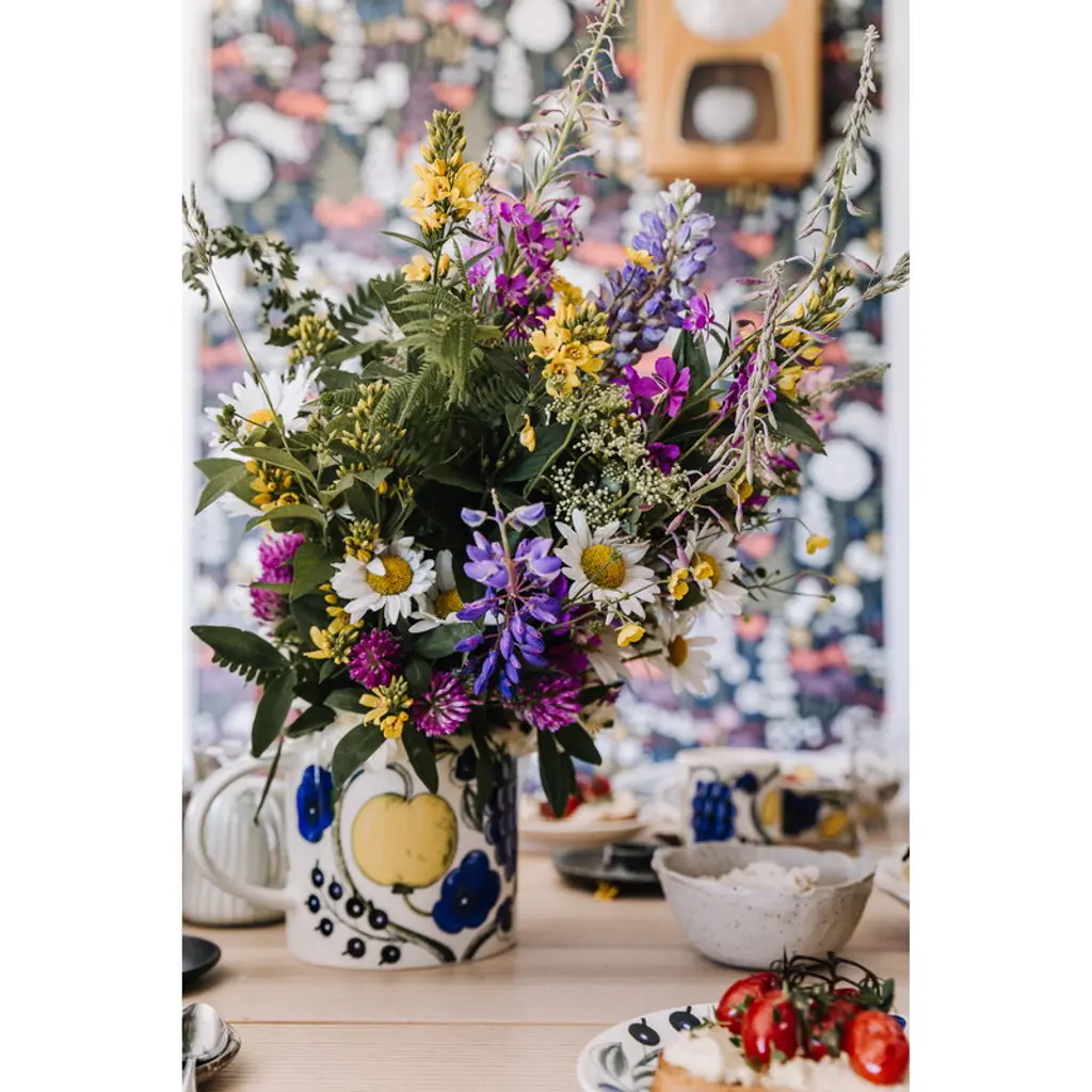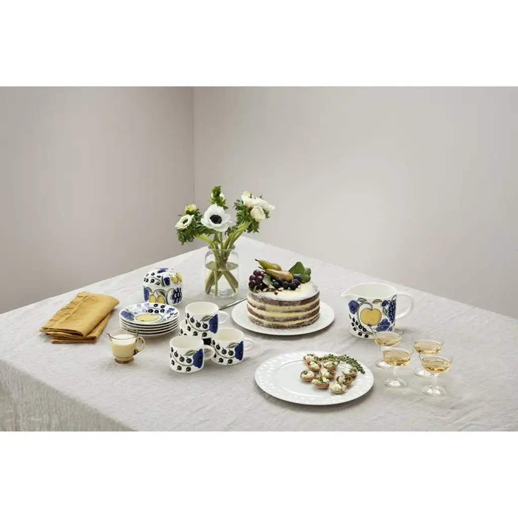 The Paratiisi pitcher by Arabia is adorned with Birger Kaipiainen's yellow-blue theme that gives a timeless, summery spirit for the abundant floral pattern. Arabia’s Paratiisi, Finnish for paradise, was designed by Birger Kaipiainen, the award-winning Finnish ceramic artist. The tableware features a simple and beautiful shape complemented by a rich design of fruits, violets and black currants. Created in 1969, Paratiisi is still one of Finland’s most beloved tableware classics.