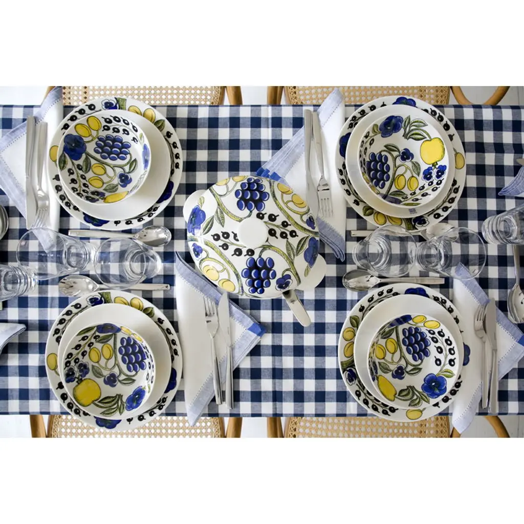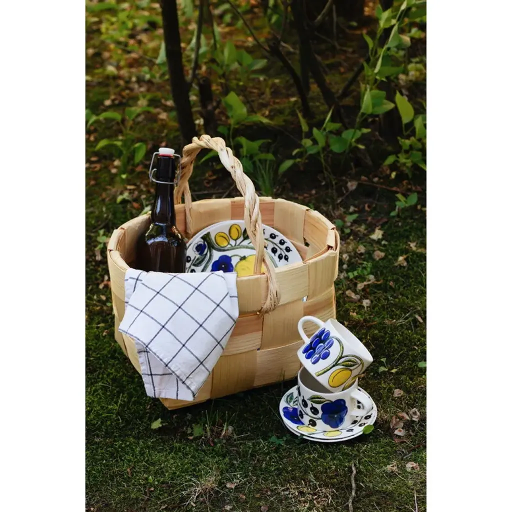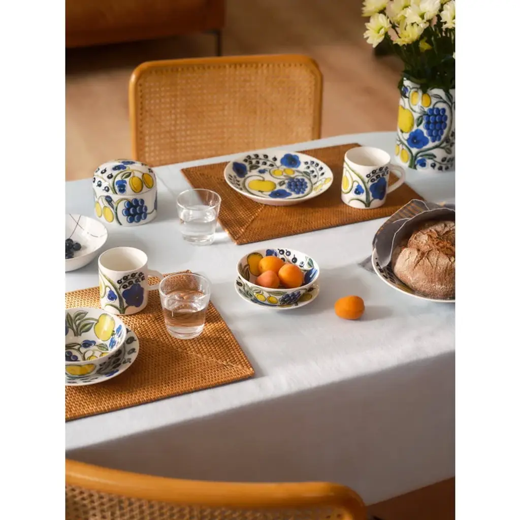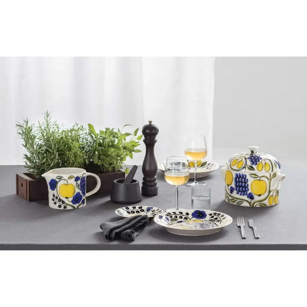 The Paratiisi plate by Arabia is adorned with Birger Kaipiainen's yellow-blue theme that gives a timeless, summery spirit for the abundant floral pattern. Arabia’s Paratiisi, Finnish for paradise, was designed by Birger Kaipiainen, the award-winning Finnish ceramic artist. The tableware features a simple and beautiful shape complemented by a rich design of fruits, violets and black currants. Created in 1969, Paratiisi is still one of Finland’s most beloved tableware classics.