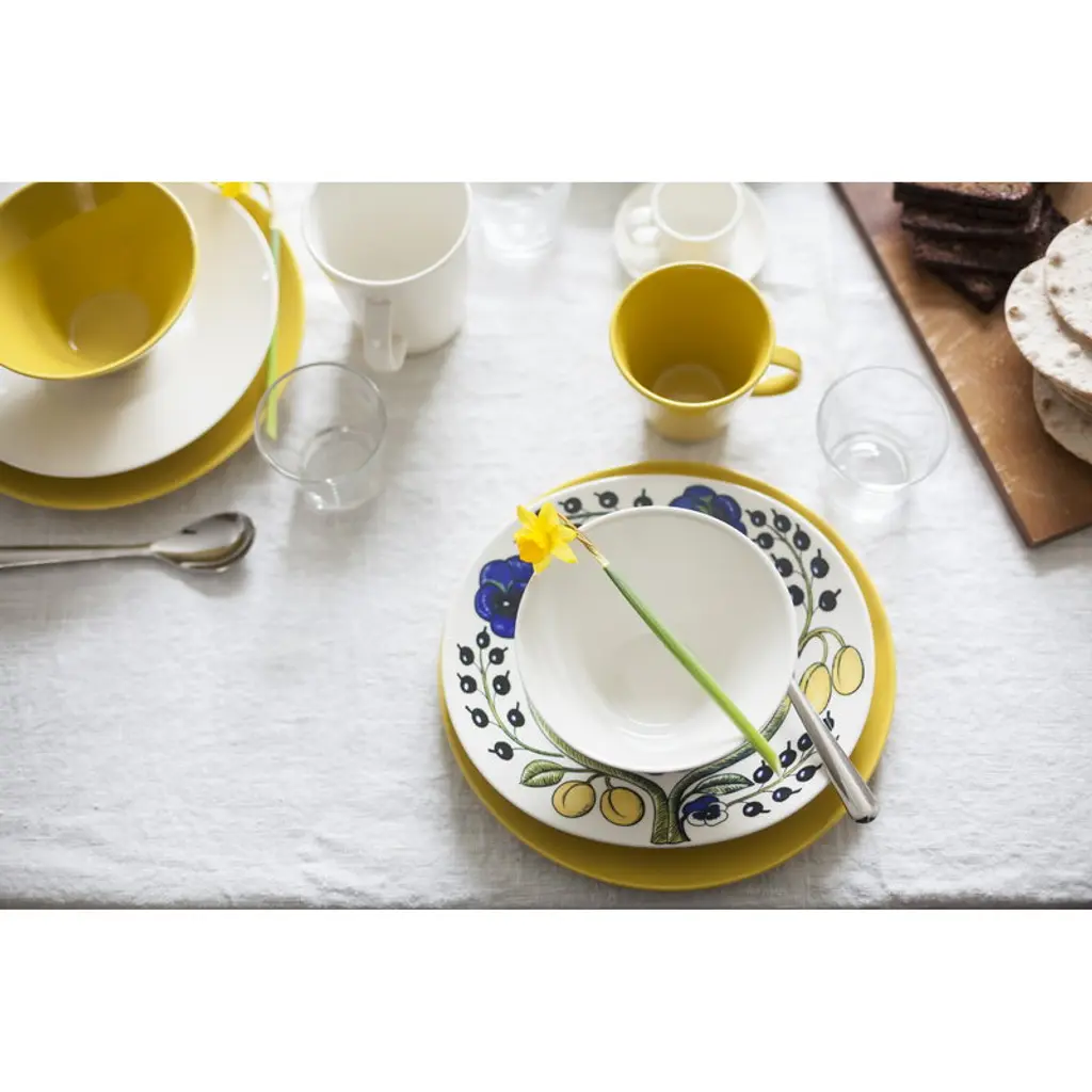 The Paratiisi plate by Arabia is adorned with Birger Kaipiainen's yellow-blue theme that gives a timeless, summery spirit for the abundant floral pattern. Arabia’s Paratiisi, Finnish for paradise, was designed by Birger Kaipiainen, the award-winning Finnish ceramic artist. The tableware features a simple and beautiful shape complemented by a rich design of fruits, violets and black currants. Created in 1969, Paratiisi is still one of Finland’s most beloved tableware classics.