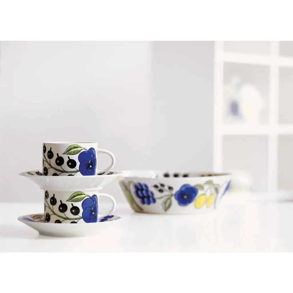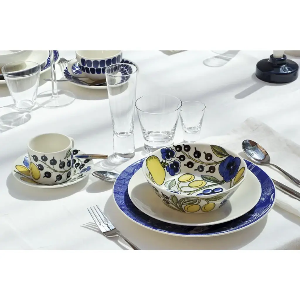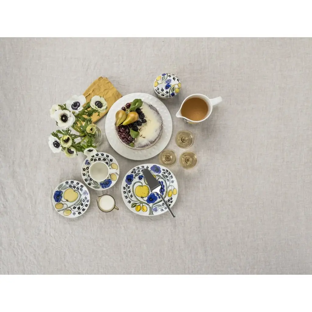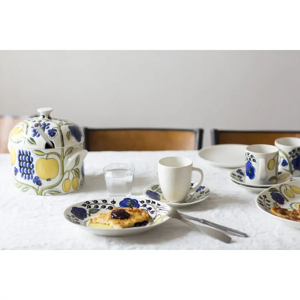 The Paratiisi saucer by Arabia is adorned with Birger Kaipiainen's yellow-blue theme that gives a timeless, summery spirit for the abundant floral pattern. Arabia’s Paratiisi, Finnish for paradise, was designed by Birger Kaipiainen, the award-winning Finnish ceramic artist. The tableware features a simple and beautiful shape complemented by a rich design of fruits, violets and black currants. Created in 1969, Paratiisi is still one of Finland’s most beloved tableware classics.