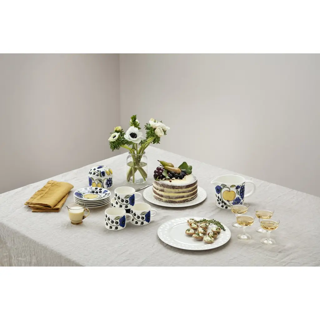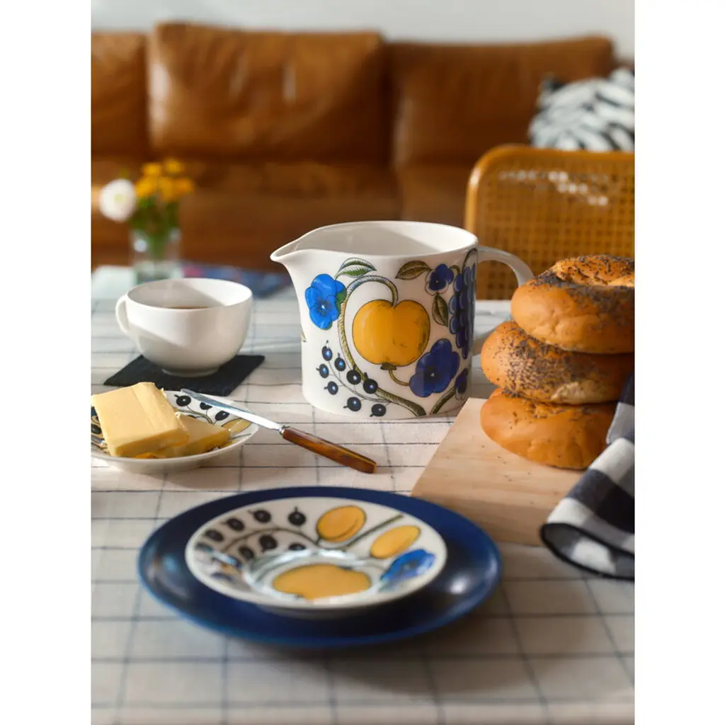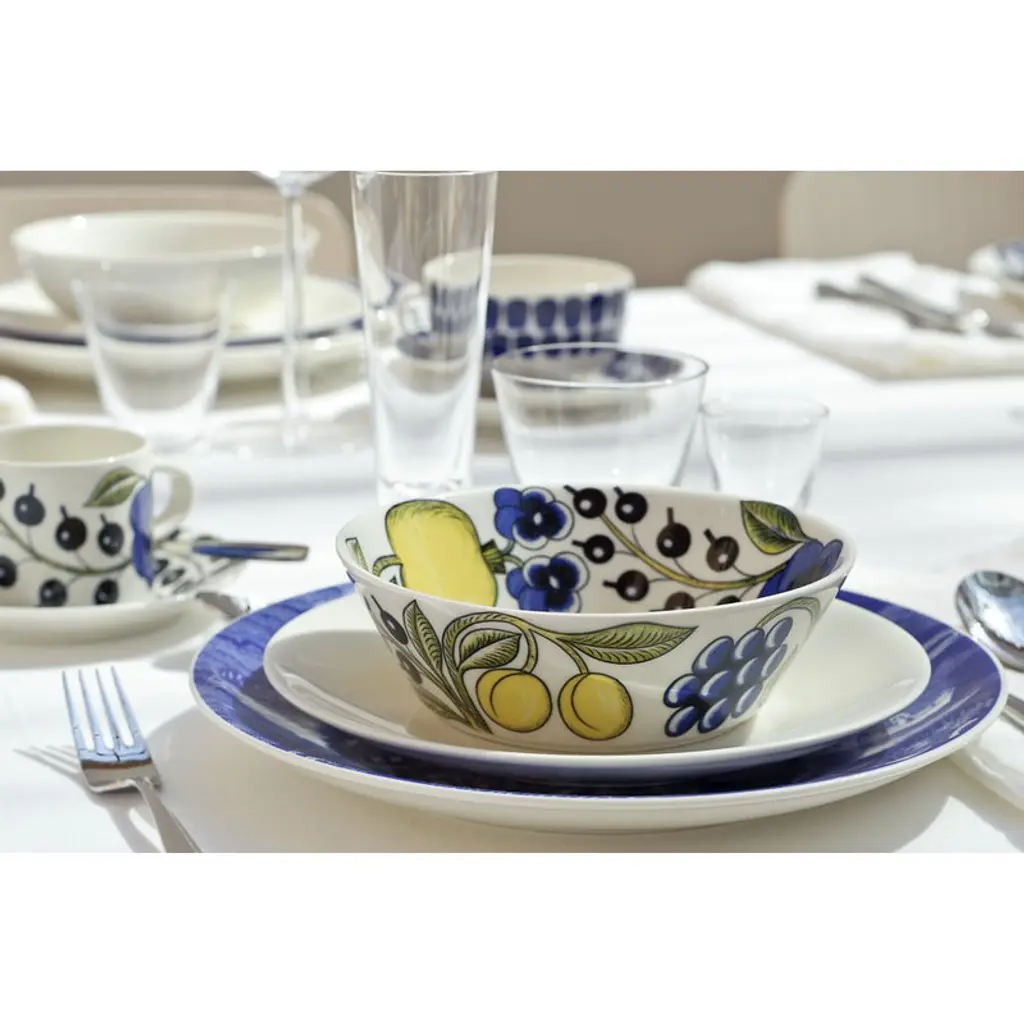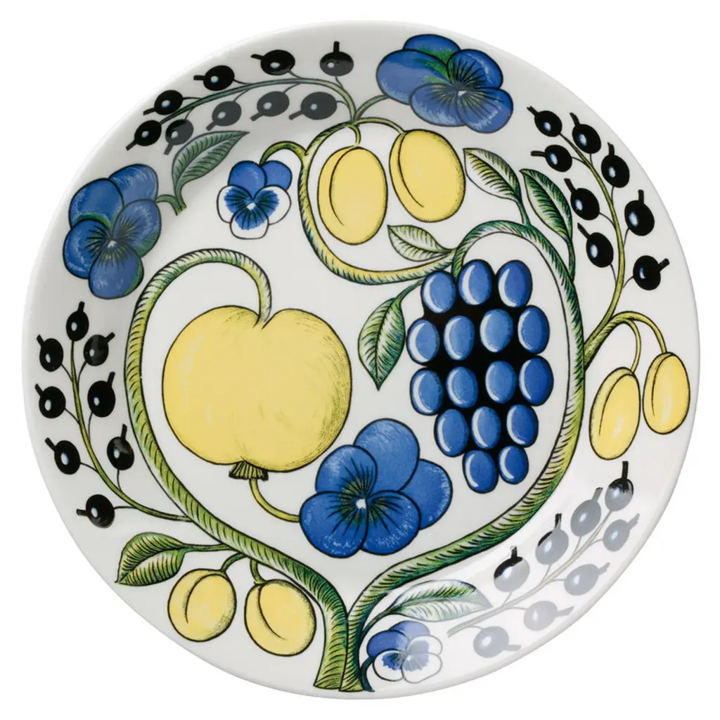 The Paratiisi saucer by Arabia is adorned with Birger Kaipiainen's yellow-blue theme that gives a timeless, summery spirit for the abundant floral pattern. Arabia’s Paratiisi, Finnish for paradise, was designed by Birger Kaipiainen, the award-winning Finnish ceramic artist. The tableware features a simple and beautiful shape complemented by a rich design of fruits, violets and black currants. Created in 1969, Paratiisi is still one of Finland’s most beloved tableware classics.