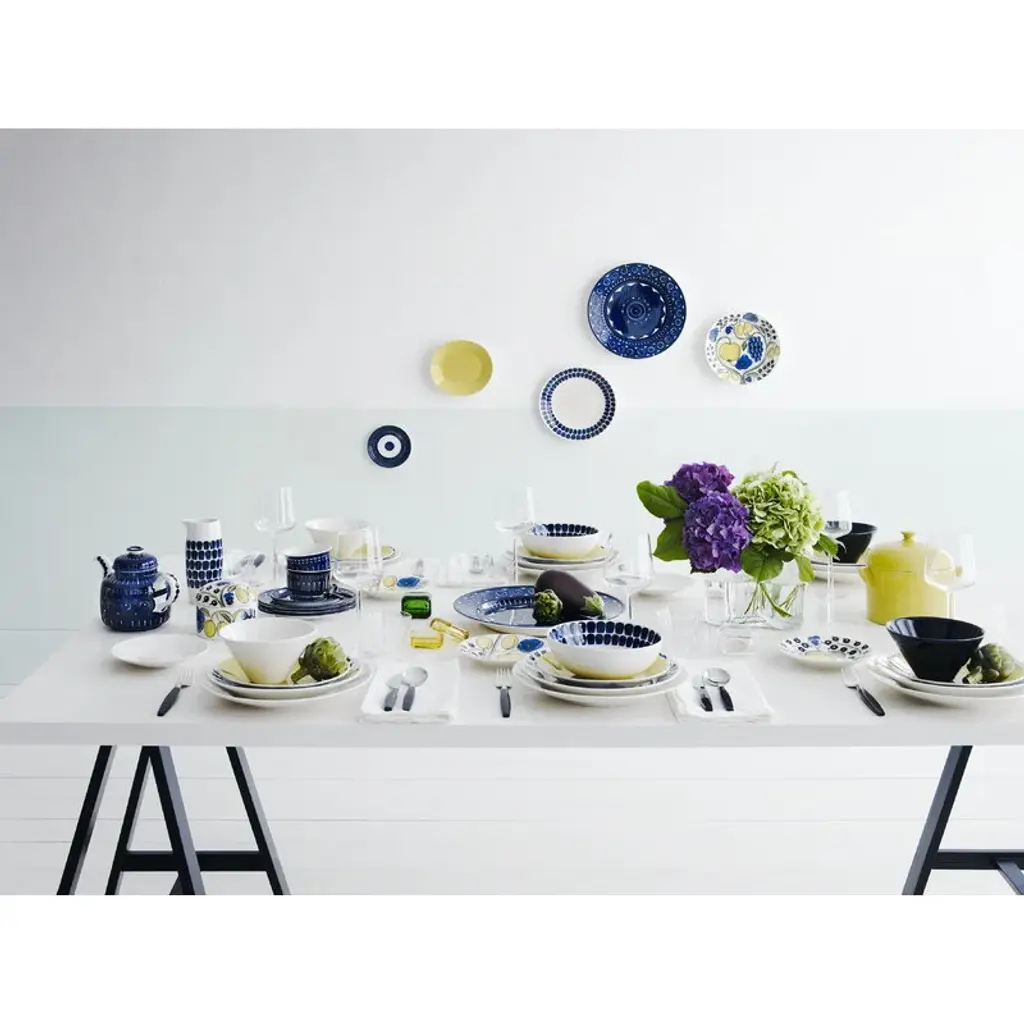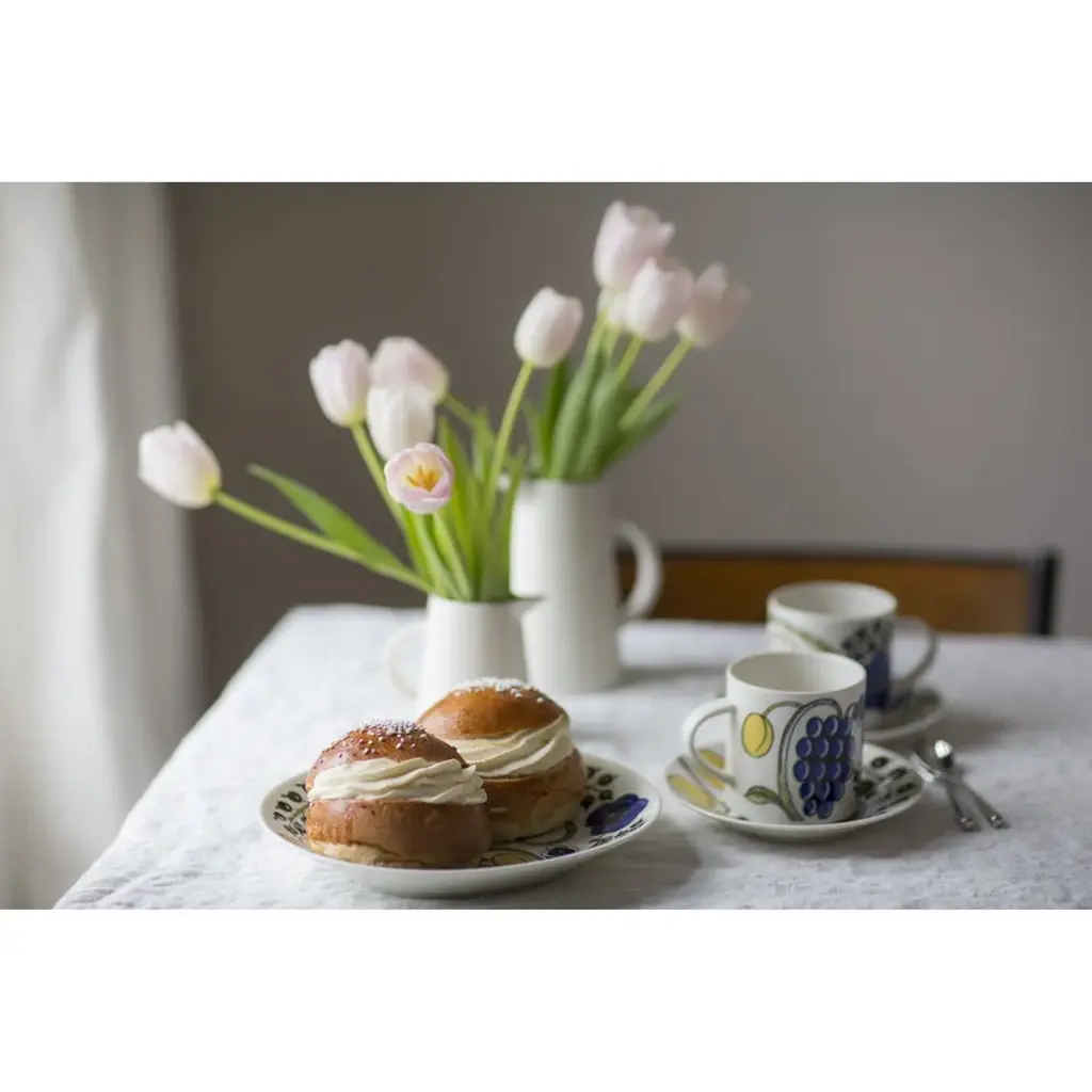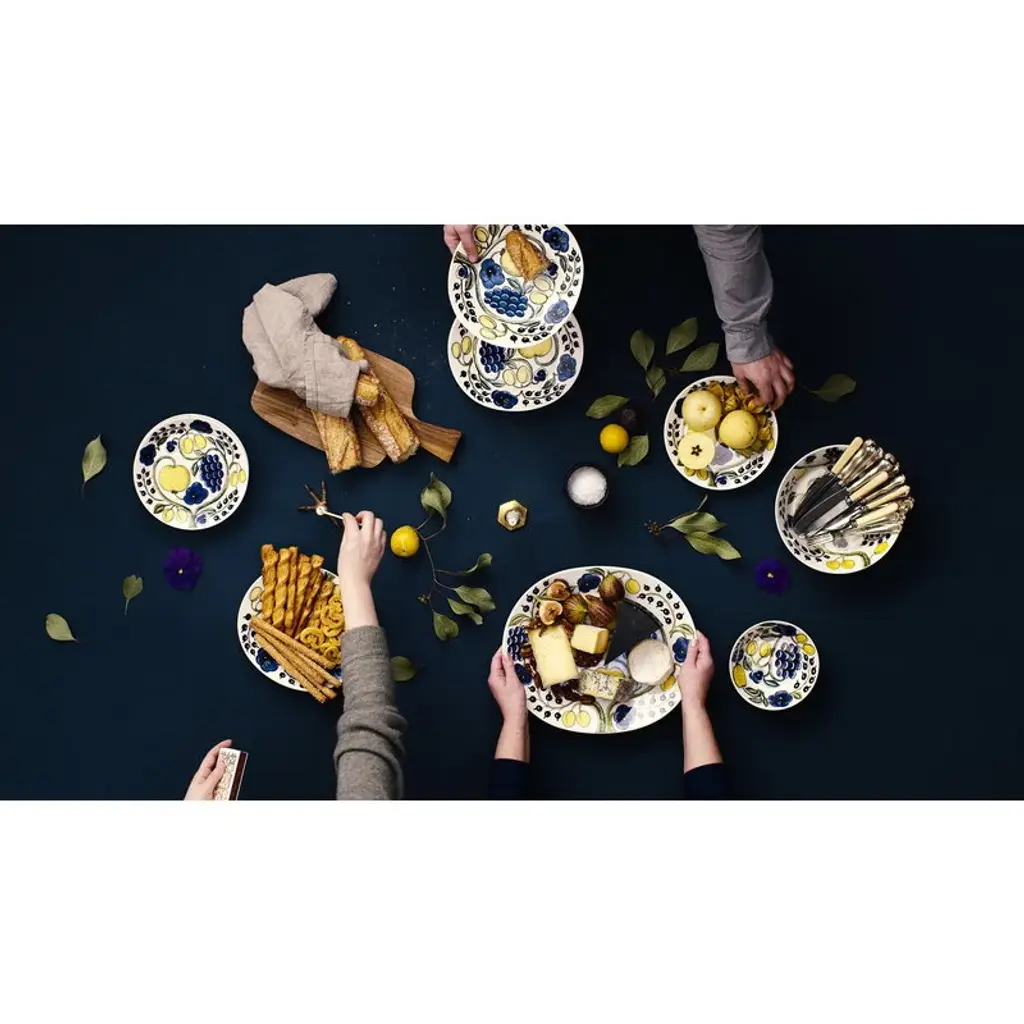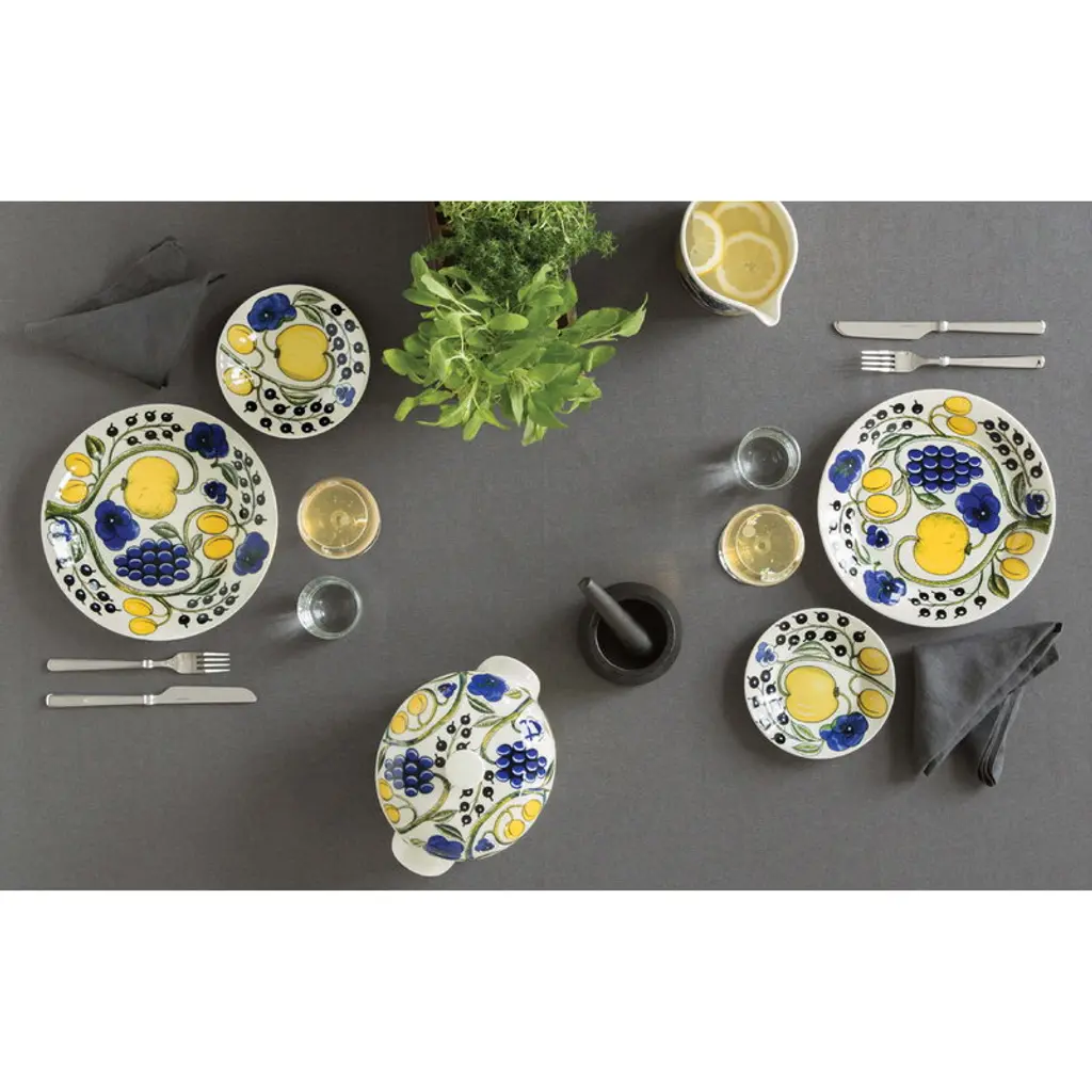 The Paratiisi saucer by Arabia is adorned with Birger Kaipiainen's yellow-blue theme that gives a timeless, summery spirit for the abundant floral pattern. Arabia’s Paratiisi, Finnish for paradise, was designed by Birger Kaipiainen, the award-winning Finnish ceramic artist. The tableware features a simple and beautiful shape complemented by a rich design of fruits, violets and black currants. Created in 1969, Paratiisi is still one of Finland’s most beloved tableware classics.