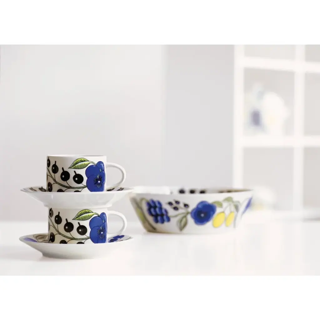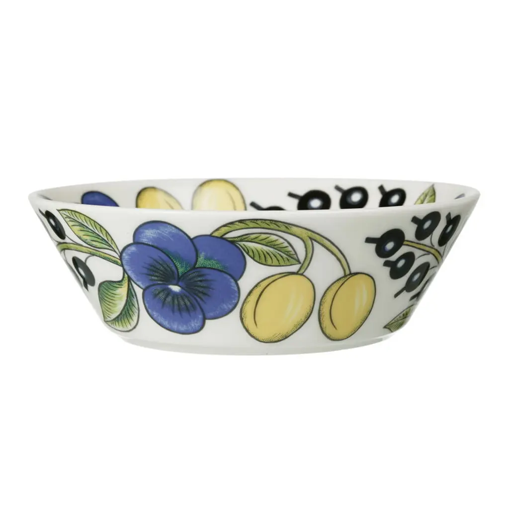 The Paratiisi serving bowl by Arabia is adorned with Birger Kaipiainen's yellow-blue theme that gives a timeless, summery spirit for the abundant floral pattern. Arabia’s Paratiisi, Finnish for paradise, was designed by Birger Kaipiainen, the award-winning Finnish ceramic artist. The tableware features a simple and beautiful shape complemented by a rich design of fruits, violets and black currants. Created in 1969, Paratiisi is still one of Finland’s most beloved tableware classics.