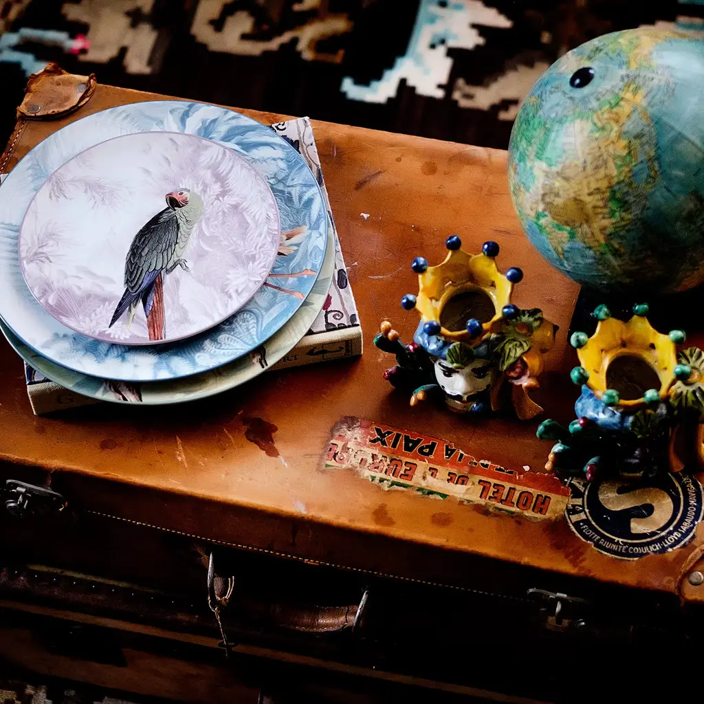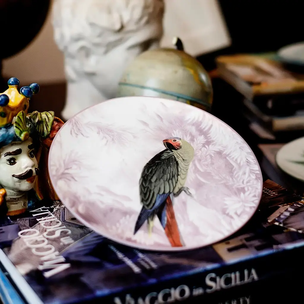 This exquisite plate will be a superb addition to both modern and traditional dining rooms to infuse them with distinctive and refined style. Part of the Ottoman Menagerie Collection. A colorful parrot is the focal point of this plate, its green, blue, and red plumage rendered in exquisite detail that approaches reality. The parrot's vibrant colors allow it to stand out against the floral background in white and gray resulting in an elegant dance of lights and shadows. This piece is best arranged with the other five of the same collection.