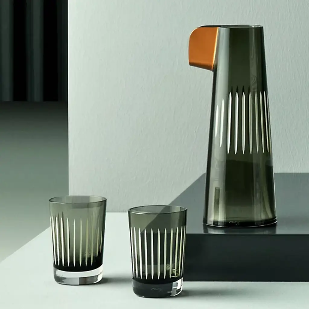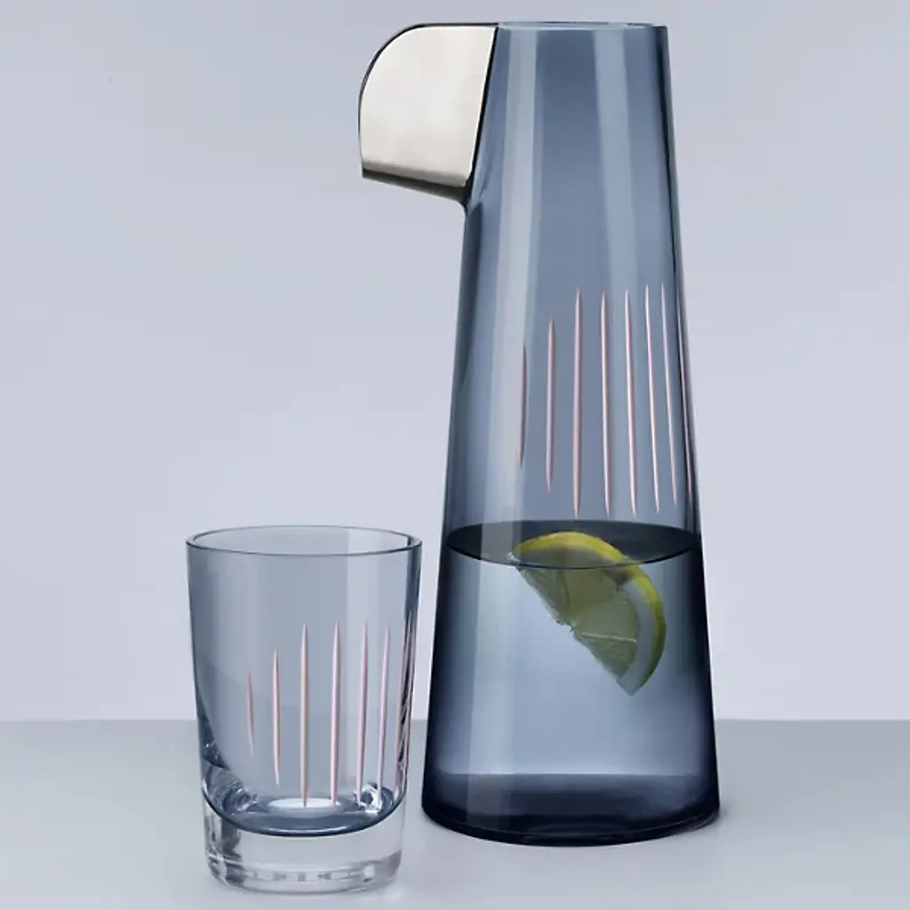 In a splash, the Parrot Water Carafe by Nude Glass compliments simple dinnerware with humor. The placement of handmade, hand-painted etchings on the outside of the carafe serves a dual purpose. On one hand the design is a nod the parrot's wings and on the other they serve as an indicator of the perfect spot to pick up the carafe. The cylinder silhouette pours well from an electric beak to the complimenting Parrot Water Glasses. Each selection of glass embodies the look of handmade crystal, etch work, and paint collection. Parrot’s whimsical design will steal attention at any gathering.