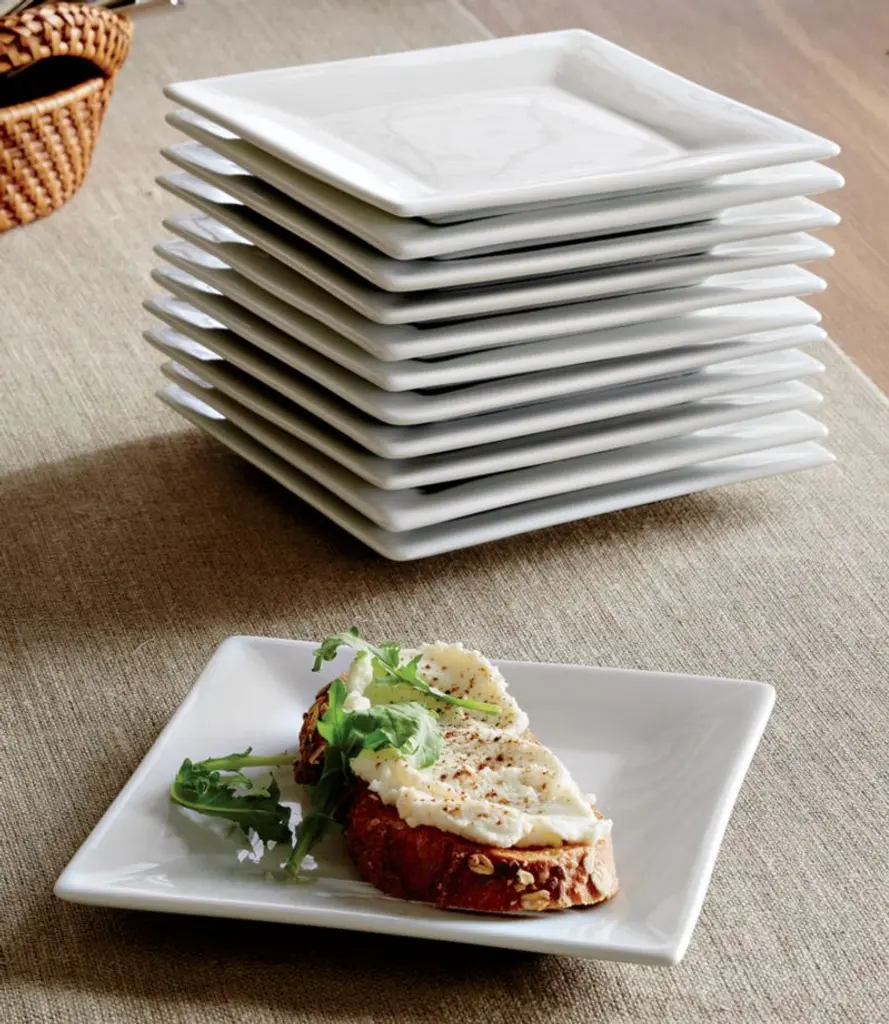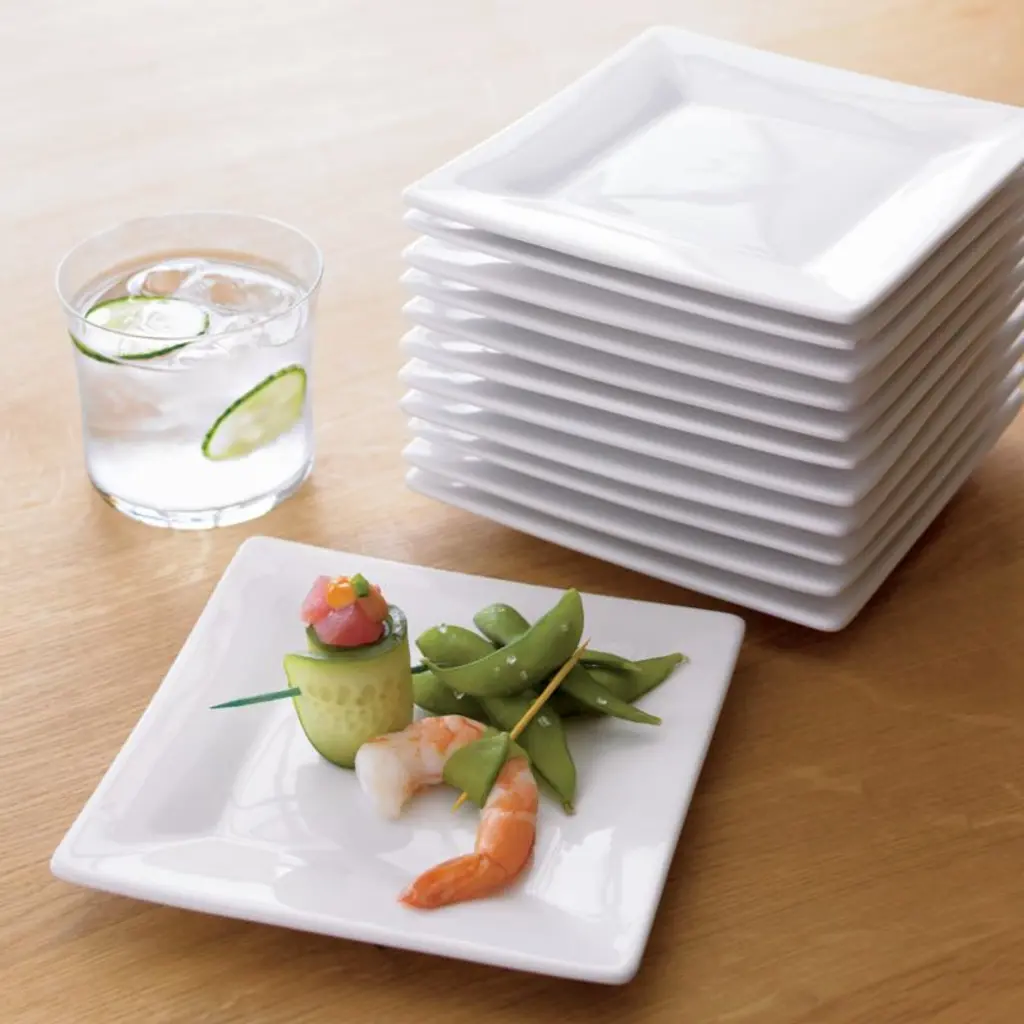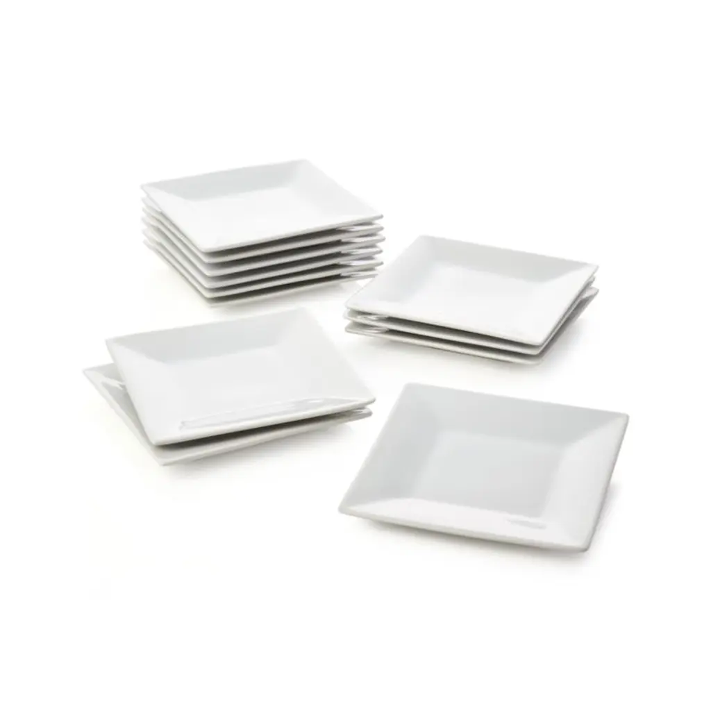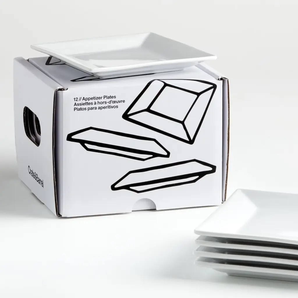 Our boxed set of square white porcelain appetizer plates delivers when unexpected guests drop in, serving an extra 12 at a moment's notice. Simply styled plates mix with other dinnerware and serving pieces and are packaged in a stylish storage box.Check out our easy tips and ideas for hosting a football viewing party.