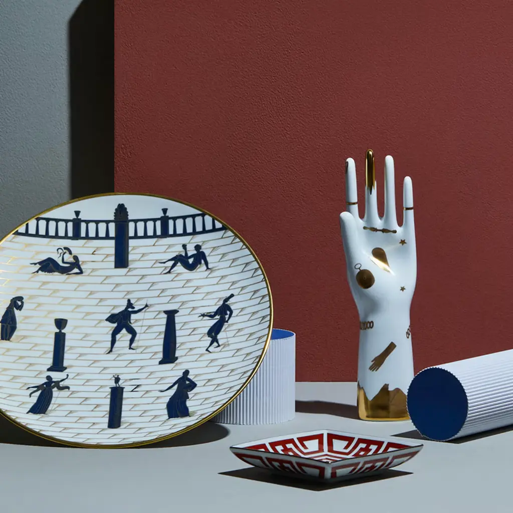 Part of the Passeggiata Archeologica, this elegant plate was designed by iconic master Gio Ponti when he was artistic director of the brand from 1923 to 1933. Made of fine porcelain, this piece is a stunning work of art that creates a surreal scene in which black figures alternate with architectural element over a white background adorned the perspective of a brick wall rendered in gold. The dreamlike quality of this decoration (whose name in Italian means Archeological Stroll) makes this a superb object that is both decorative and functional.