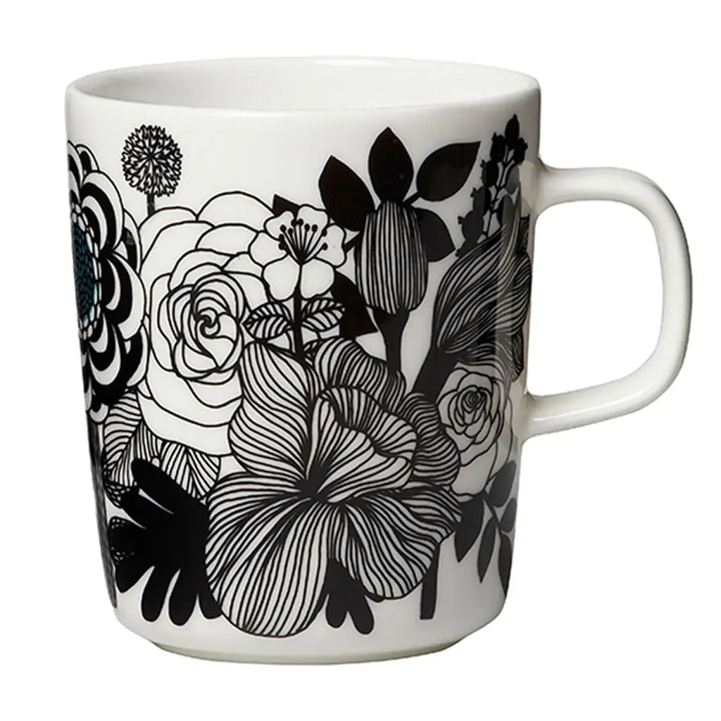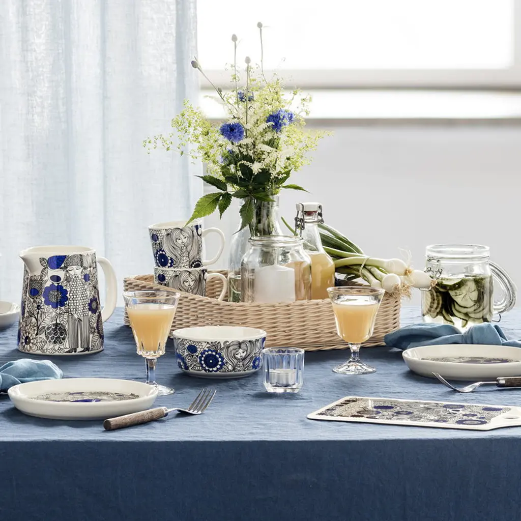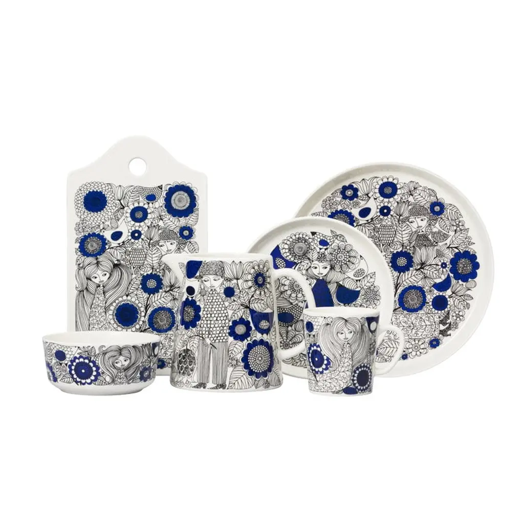 Arabia’s Pastoraali mug is adorned with the organic pattern Esteri Tomula designed in 1965. Pastoraali, featuring human characters among flowers, leaves and birds, was given a deep shade of blue since the new silk screen-printing technique allowed the use of bright colors. The rich pastoral landscapes have been printed on white, clean-lined ceramic tableware.