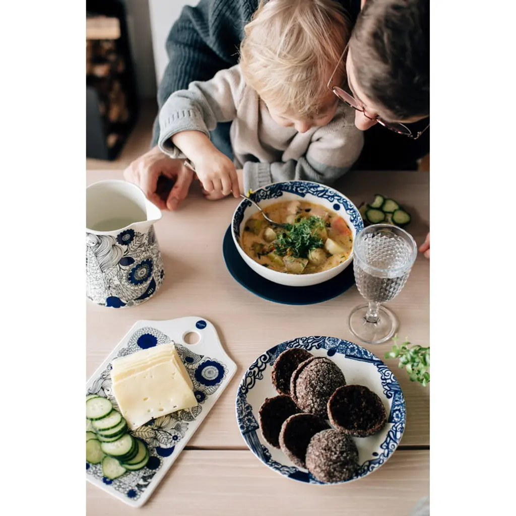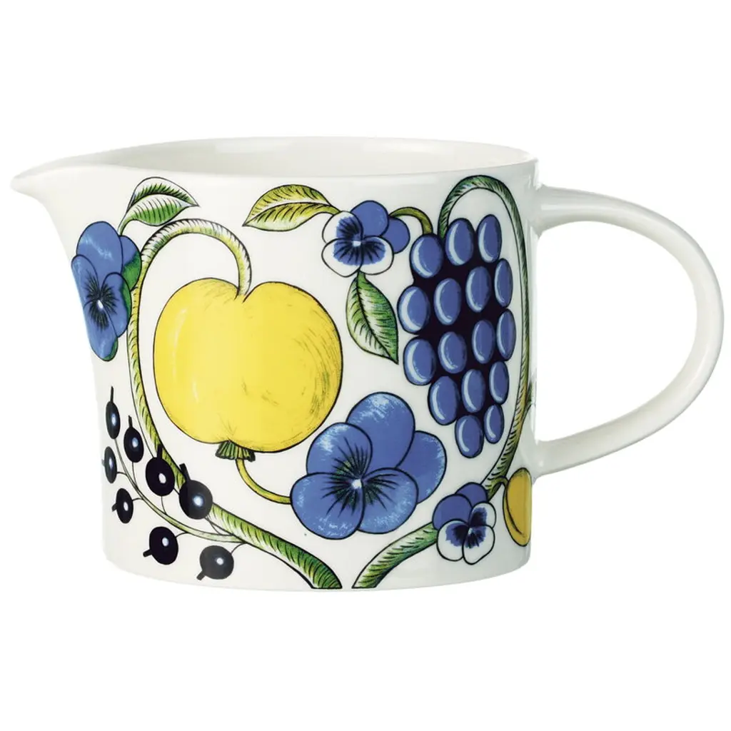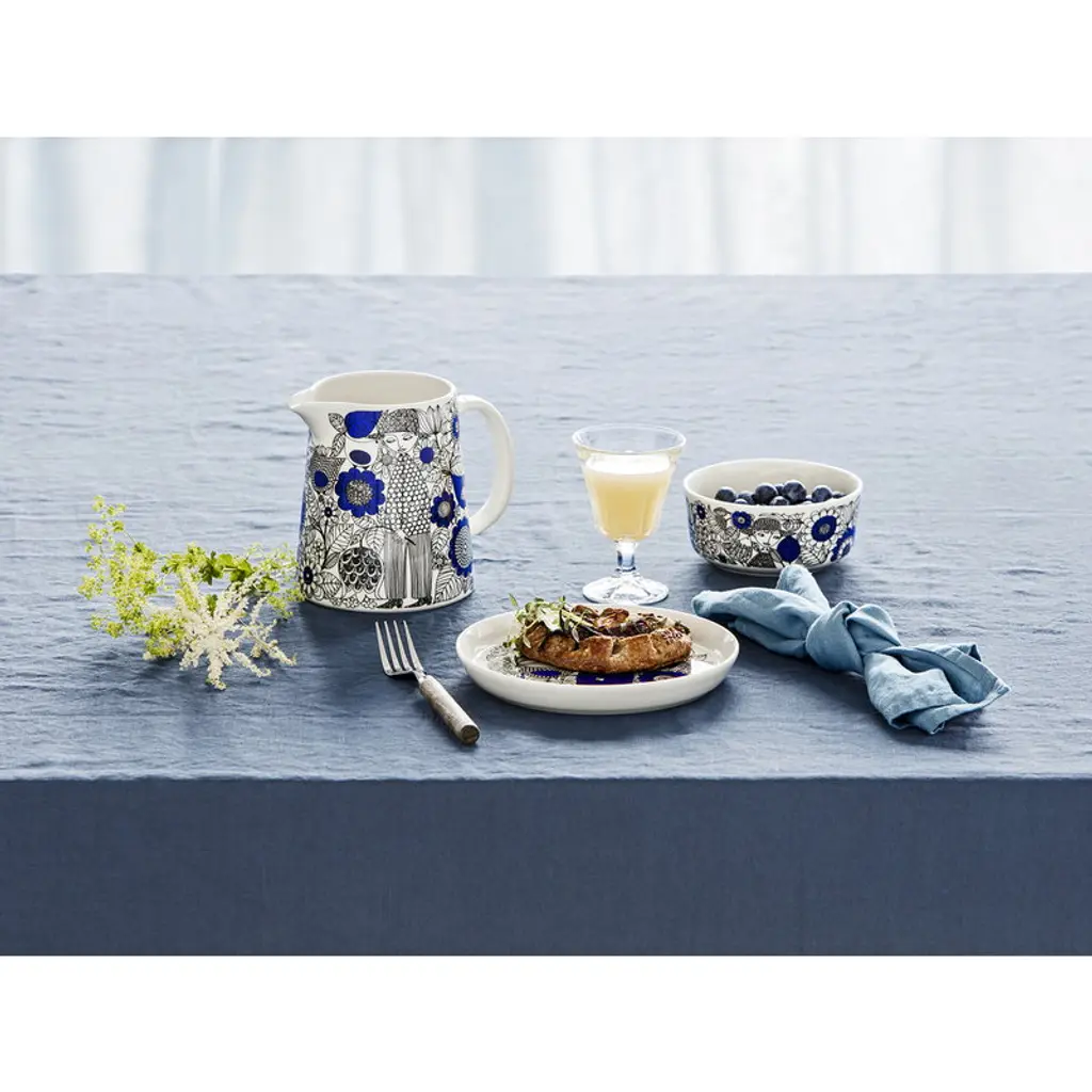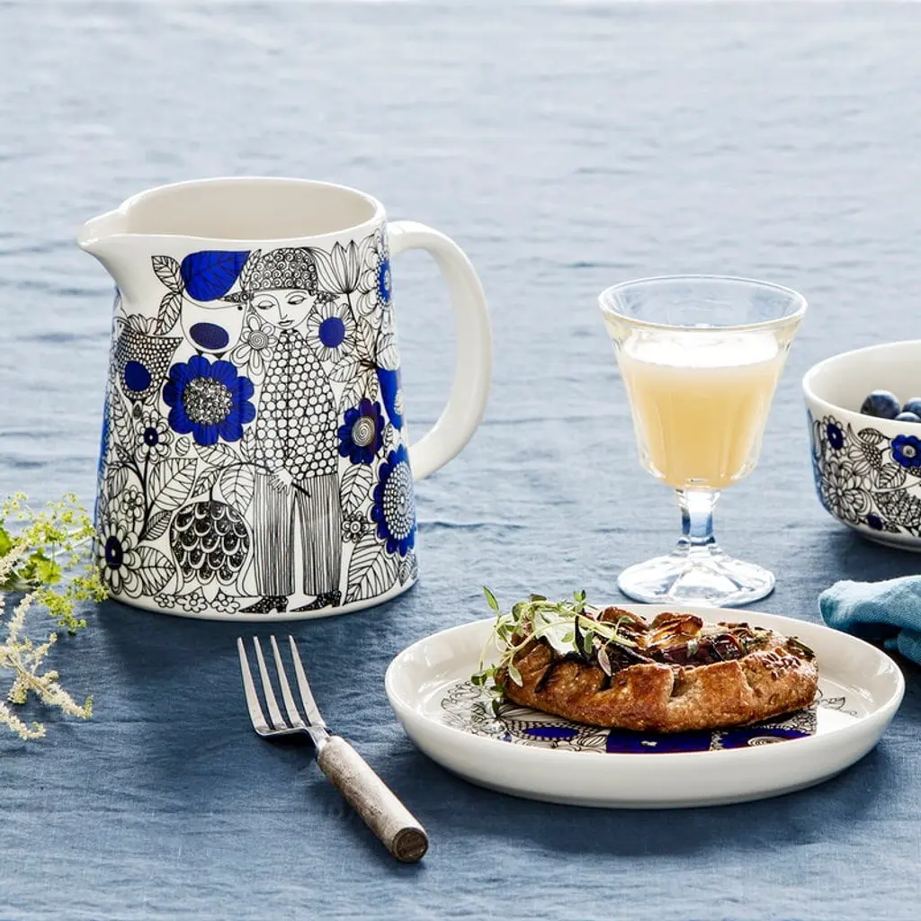 Arabia’s Pastoraali pitcher is adorned with the organic pattern Esteri Tomula designed in 1965. Pastoraali, featuring human characters among flowers, leaves and birds, was given a deep shade of blue since the new silk screen-printing technique allowed the use of bright colors. The rich pastoral landscapes have been printed on white, clean-lined ceramic tableware.