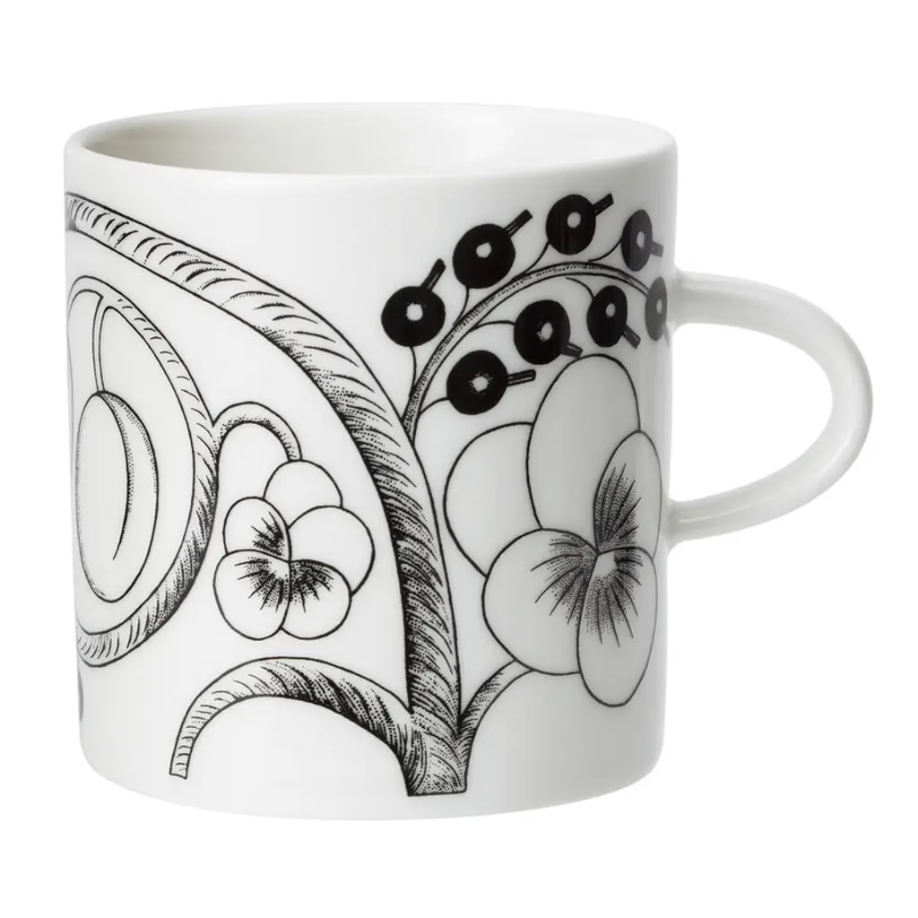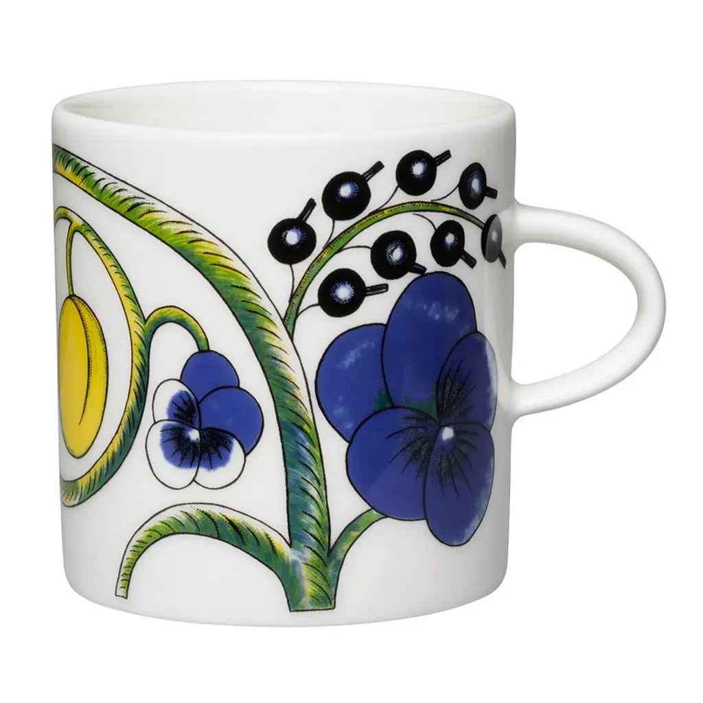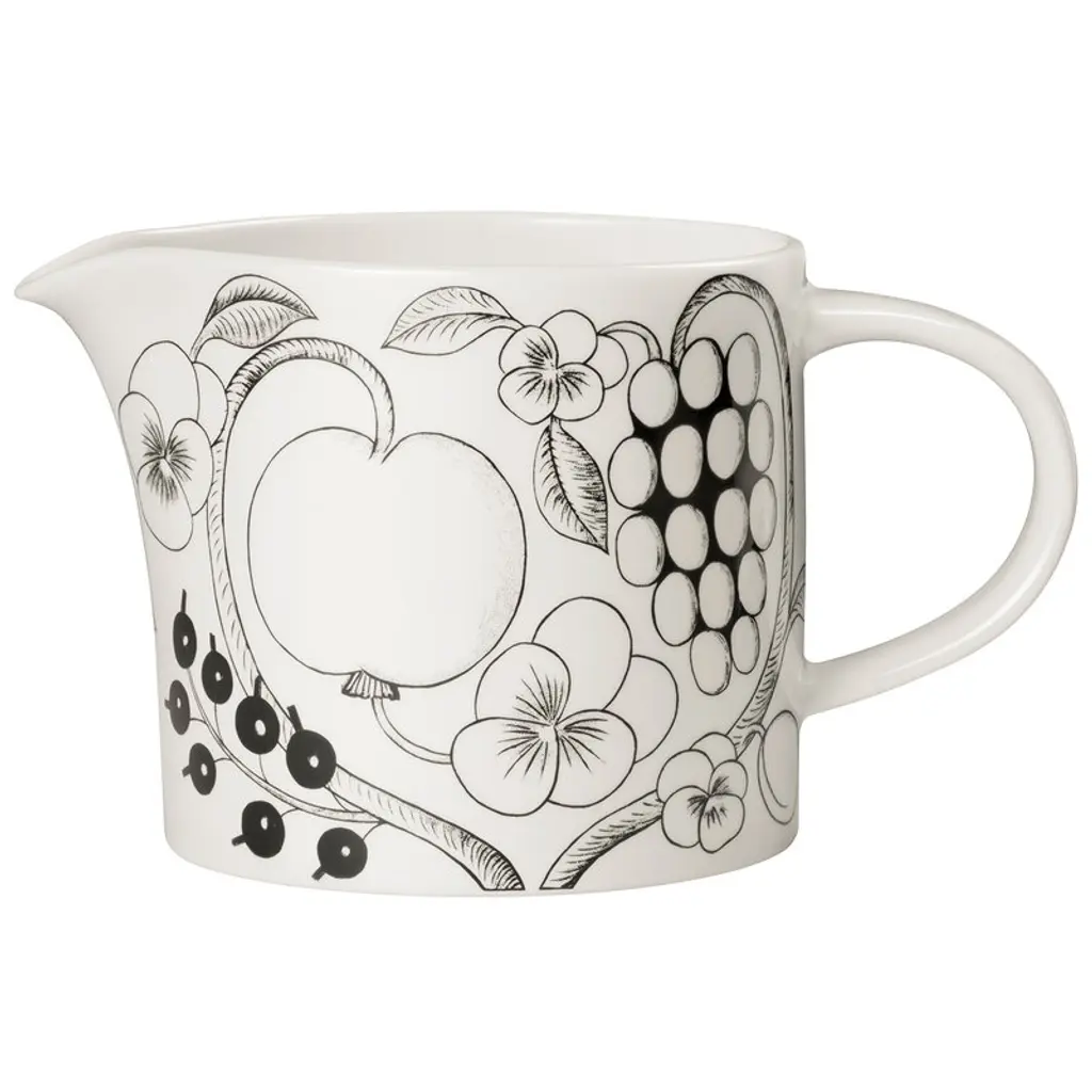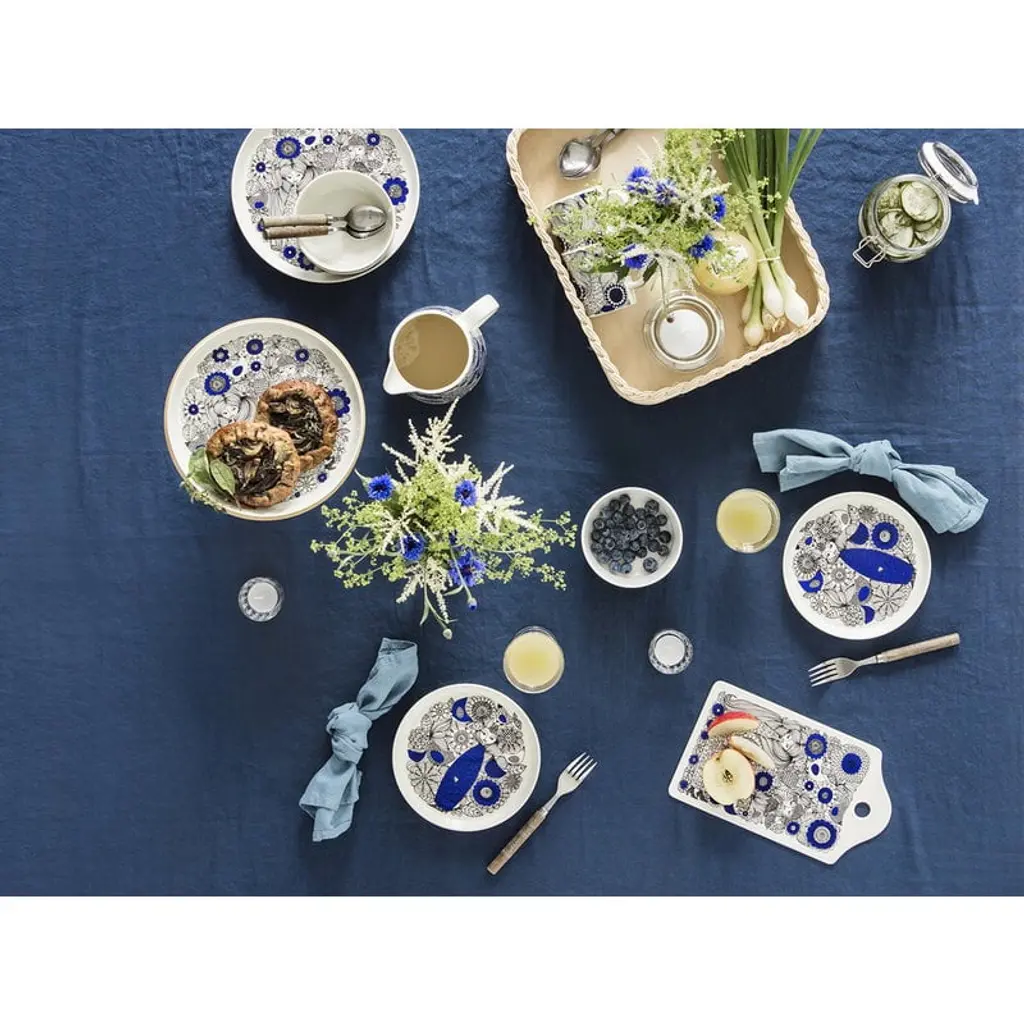 Arabia’s Pastoraali pitcher is adorned with the organic pattern Esteri Tomula designed in 1965. Pastoraali, featuring human characters among flowers, leaves and birds, was given a deep shade of blue since the new silk screen-printing technique allowed the use of bright colors. The rich pastoral landscapes have been printed on white, clean-lined ceramic tableware.
