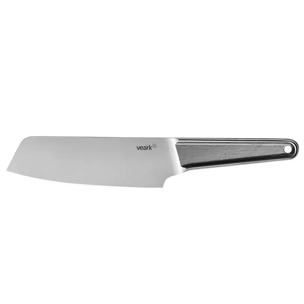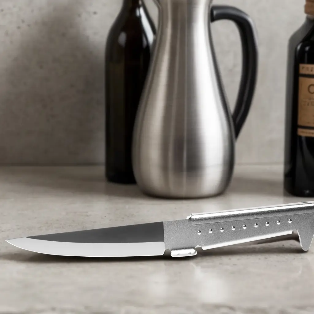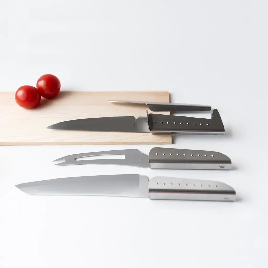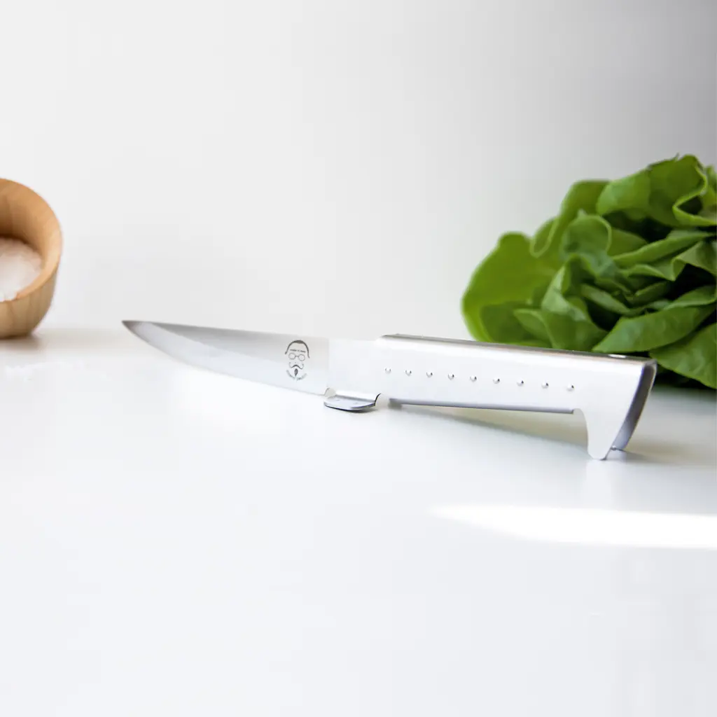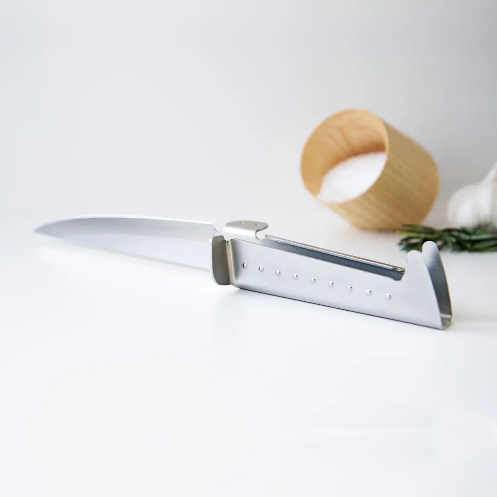 The Chef Knife 11″ by Tiaziano Paulon is a captivating blend of tradition and innovation, meticulously crafted to meet the needs of both seasoned chefs and kitchen enthusiasts. Its robust design and safety features ensure effortless and secure handling, while the strategically offset blade and perforations offer exceptional precision and versatility. Crafted from a single piece of premium-grade material, this knife guarantees durability and hygiene, free from welds or rivets. Hand-sharpened for impeccable cuts and prolonged edge retention, it stands as a symbol of culinary sophistication. Complete with a protective sheath for added convenience and safety, the Chef Knife is not just a utensil but a testament to culinary excellence and mastery.