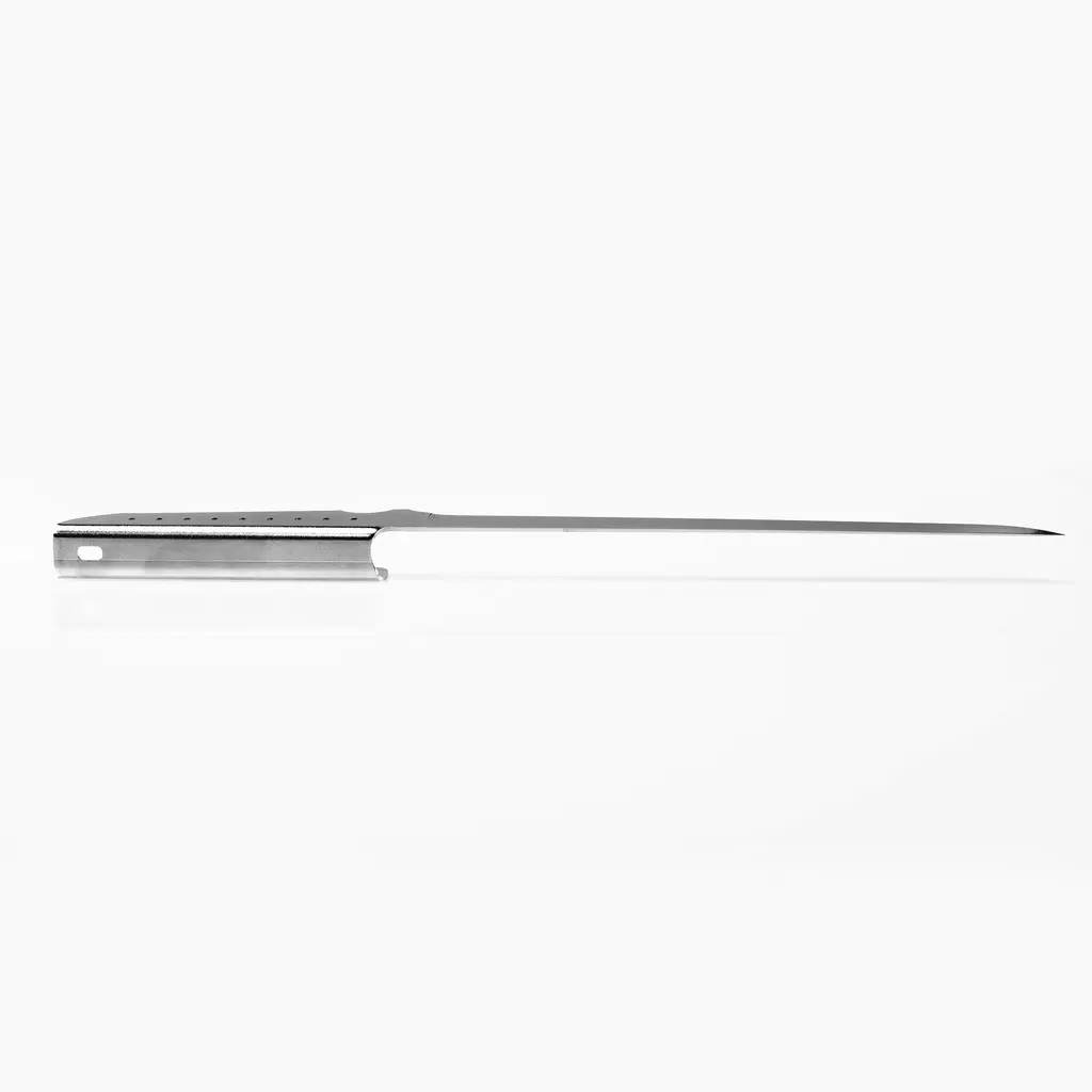 The Tiziano Paulon Fillet/Slicing Knife is a professional-grade kitchen tool designed for filleting fish with precision and ease. Its highly flexible blade also excels at slicing meats like roast beef and prosciutto. Crafted through years of research and innovation, it features an ergonomic handle for a secure grip and optimal control. The hand-sharpened blade, made from a special carbon steel alloy, ensures razor-sharp cuts and long-lasting performance. Complete with a protective sheath for safety and hygiene, this knife is an essential addition to any kitchen, offering versatility, durability, and quality craftsmanship.