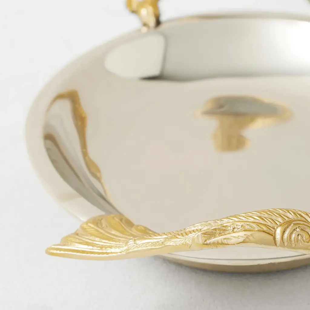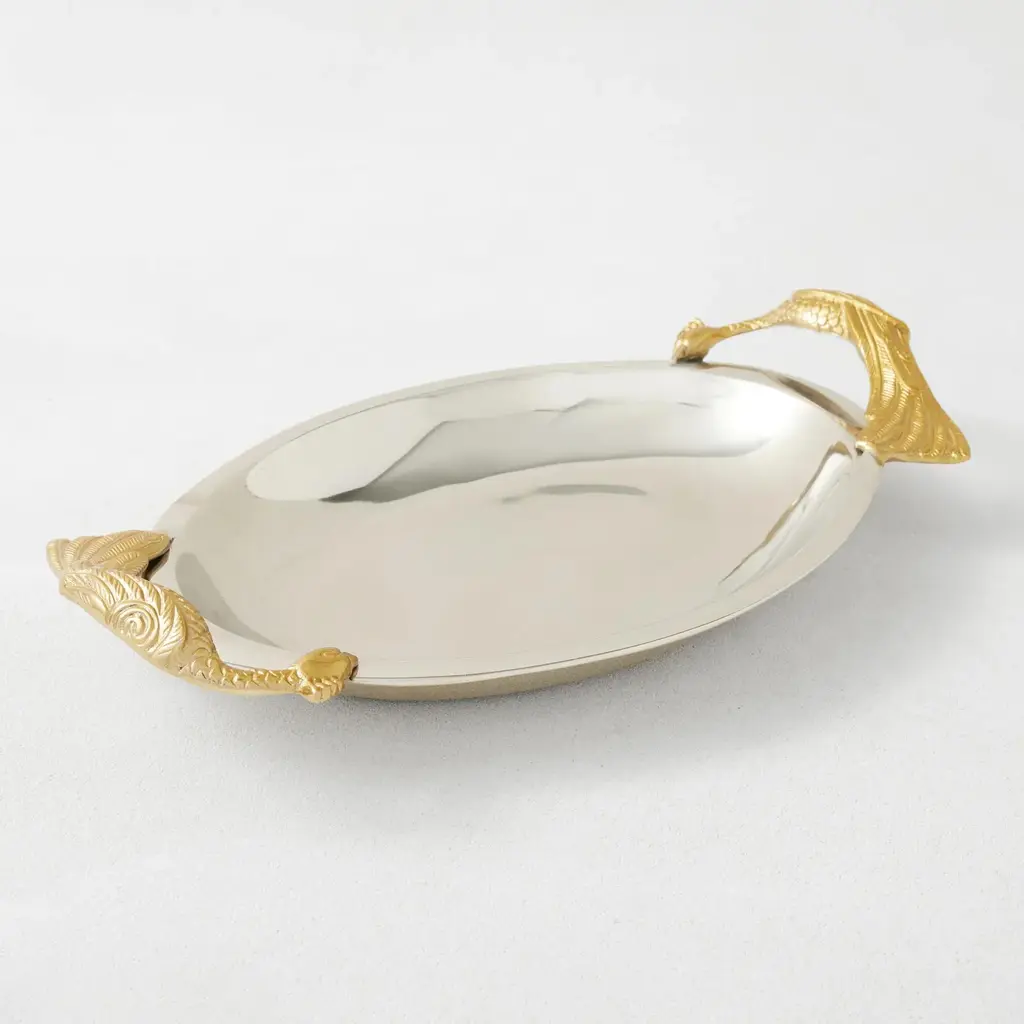 A stylish addition to the vanity, bar, or coffee table. This tray is crafted of stainless-steel with a gleaming silver finish, and stunning peacock handles in a contrasting gold.