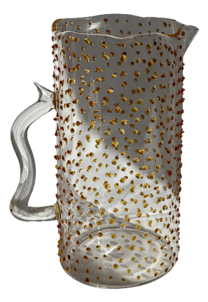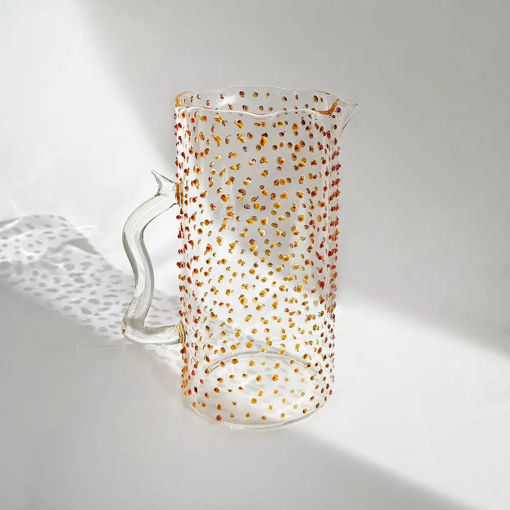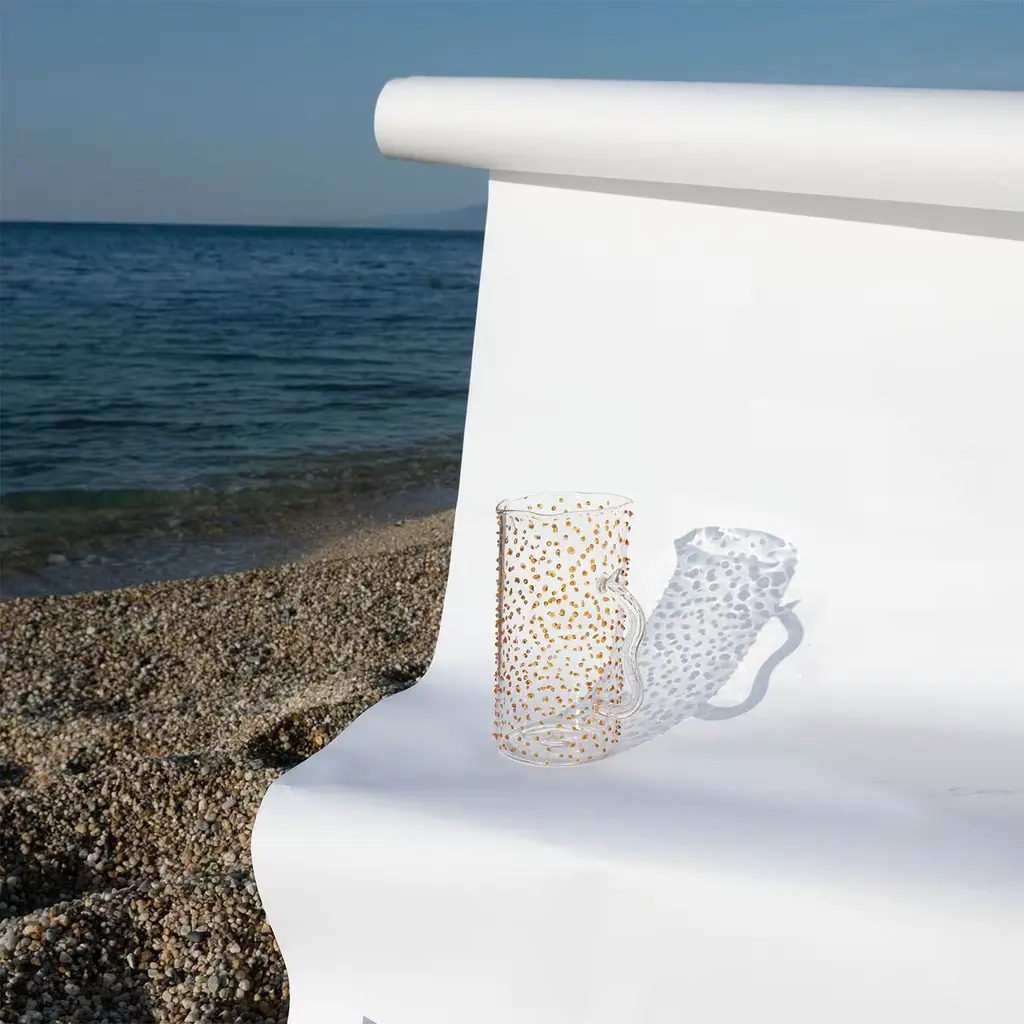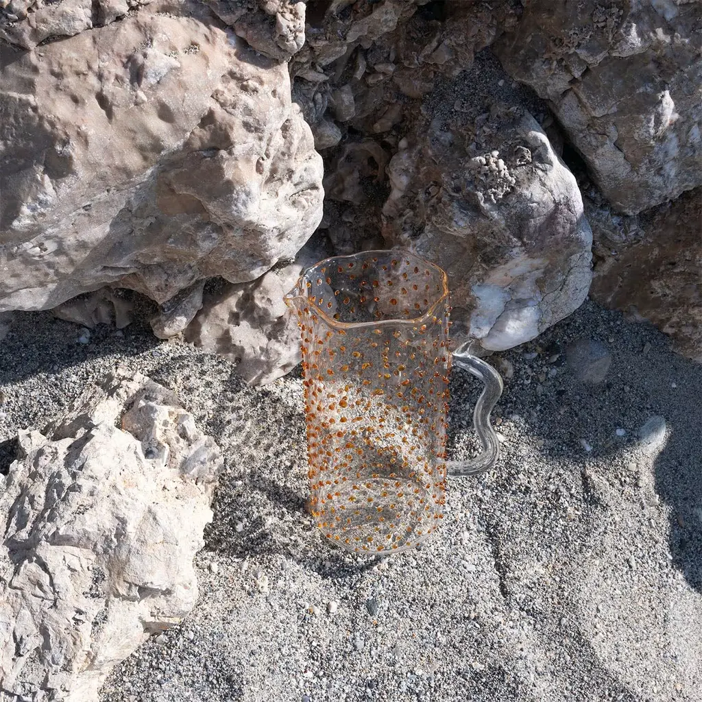 Each piece is meticulously handcrafted in Italy by master glassmakers using high-quality borosilicate glass. Resistant to thermal shocks, it allows for use with both hot and cold beverages. The Pearl pitcher is available in various finishes: thin stripe, wide stripe, smooth, or droplet. In the droplet finish, each droplet is individually applied by hand, creating a rain effect. Droplets are available in four colors: emerald green, amber, mustard, or transparent.