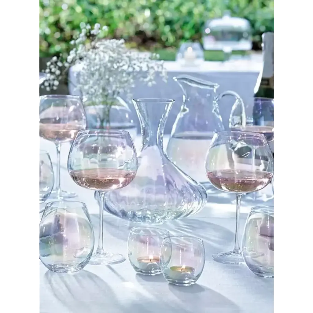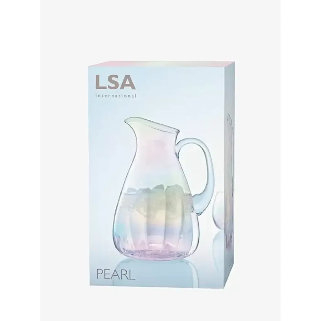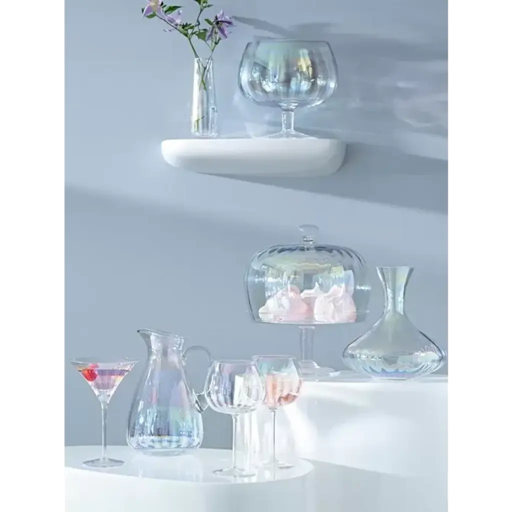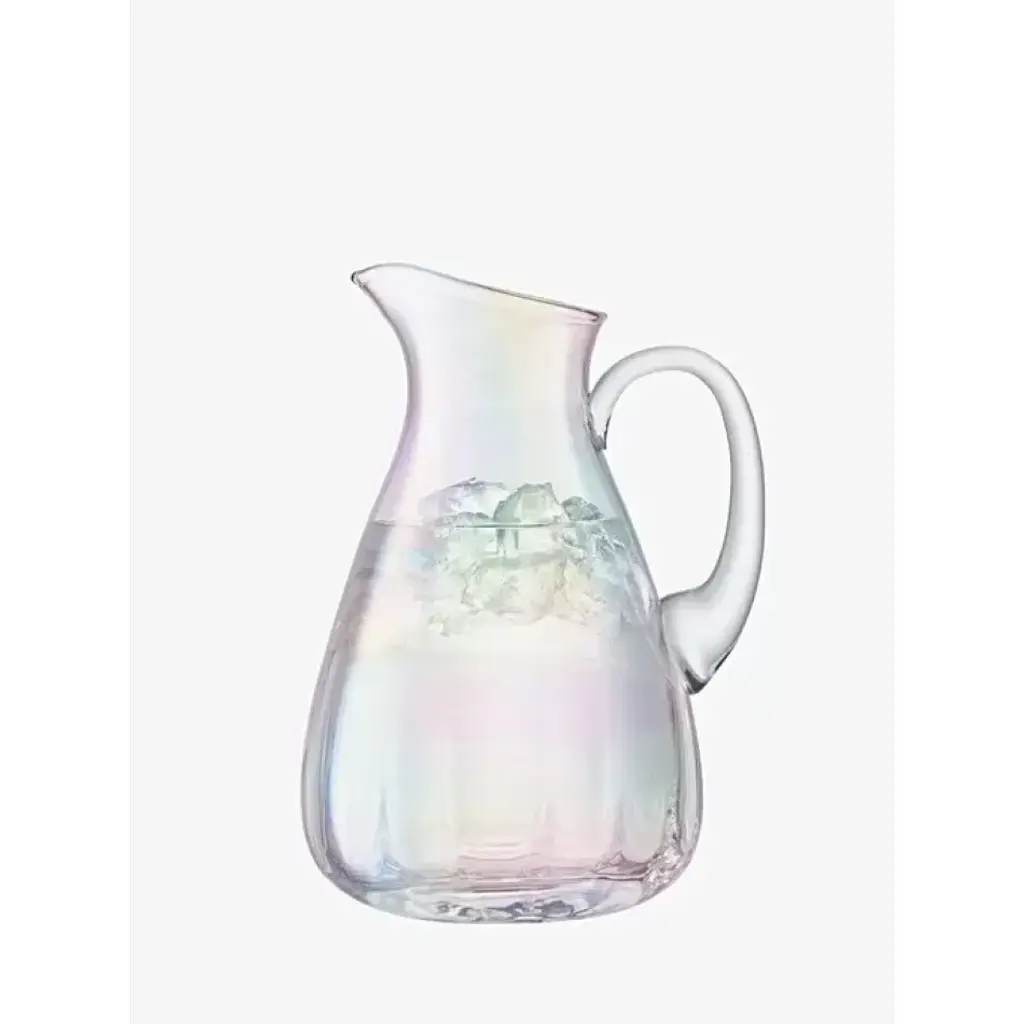 A mouth-blown glass jug hand painted with iridescent lustre. The base has a subtly-fluted texture which fades towards the rim. Mouth-blown glass Subtly-fluted texture at base of body Hand painted with pearlescent lustre