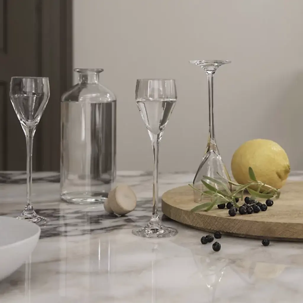 The Perfection Shot Glass, Set of 6 from Holmegaard stands out with its unusually long stem and compact bowl. The extended stem allows for elegant handling while keeping hands away from chilled contents. Tom Nybroe's design includes the collection's signature etched line for consistent portion control. The small bowl concentrates aromatics effectively, making it suitable for spirits, liqueurs, or digestifs. Machine-blown glass ensures each piece has uniform clarity and smooth transitions. These glasses add formality to spirit service, making even simple servings feel more special and deliberate.
