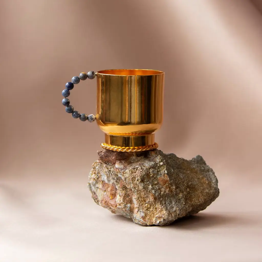 This valuable mug lends a captivating, aesthetic to the daily ritual of enjoying a steaming cup of tea or black coffee. Its glistening silhouette in gold-plated metal narrows at the base, where a graceful, rope-like elements envelopes the bottom edge. The curved handle is covered with a string of spherical, dark-toned stones, customizable in different color options, please contact the Concierge for details.