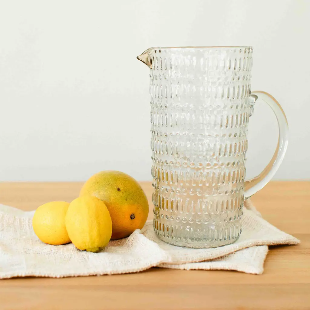 Savor and serve water, juice, and sangria in luminous Italian style with the Perle Carafe by Zafferano America. Made in Italy from exquisitely textured glass, this 54.1 oz carafe features a subtly curved handle and petite spout. Light refracts through the glass, giving the contents a gorgeous, luminous glow. With its generous capacity and elegant silhouette, the Perle carafe elevates casual dining and entertaining.