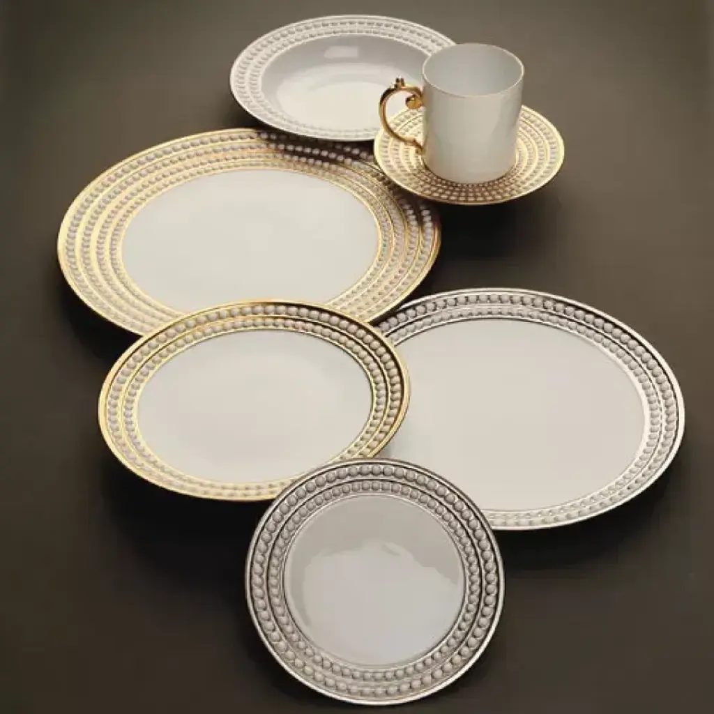 Inspired by the timeless elegance of the pearl, each piece in the Perlee collection is hand-gilded with three layers of 24 kt gold or platinum. Each piece is hand-crafted from Fine porcelain with a raised border of pearl shapes. By L'Objet. Also available in white, gold, and blue. Prior to founding L’Objet in 2004, Israeli-born Elad Yifrach was a successful designer in Beverly Hills. He was creating beautiful interiors, but he was frustrated by the limited options available in home accessories, so he set out to create something better. L’Objet’s collections are diverse, but they are almost always inspired by nature and architecture. Many of his exquisite serving pieces rest in a base of hand-crafted gold foliage, other pieces feature intricate design and beadwork, and some of the most striking objects actually look like miniature buildings. And despite the lux feel, much of the line is practical with just a touch of whimsy.