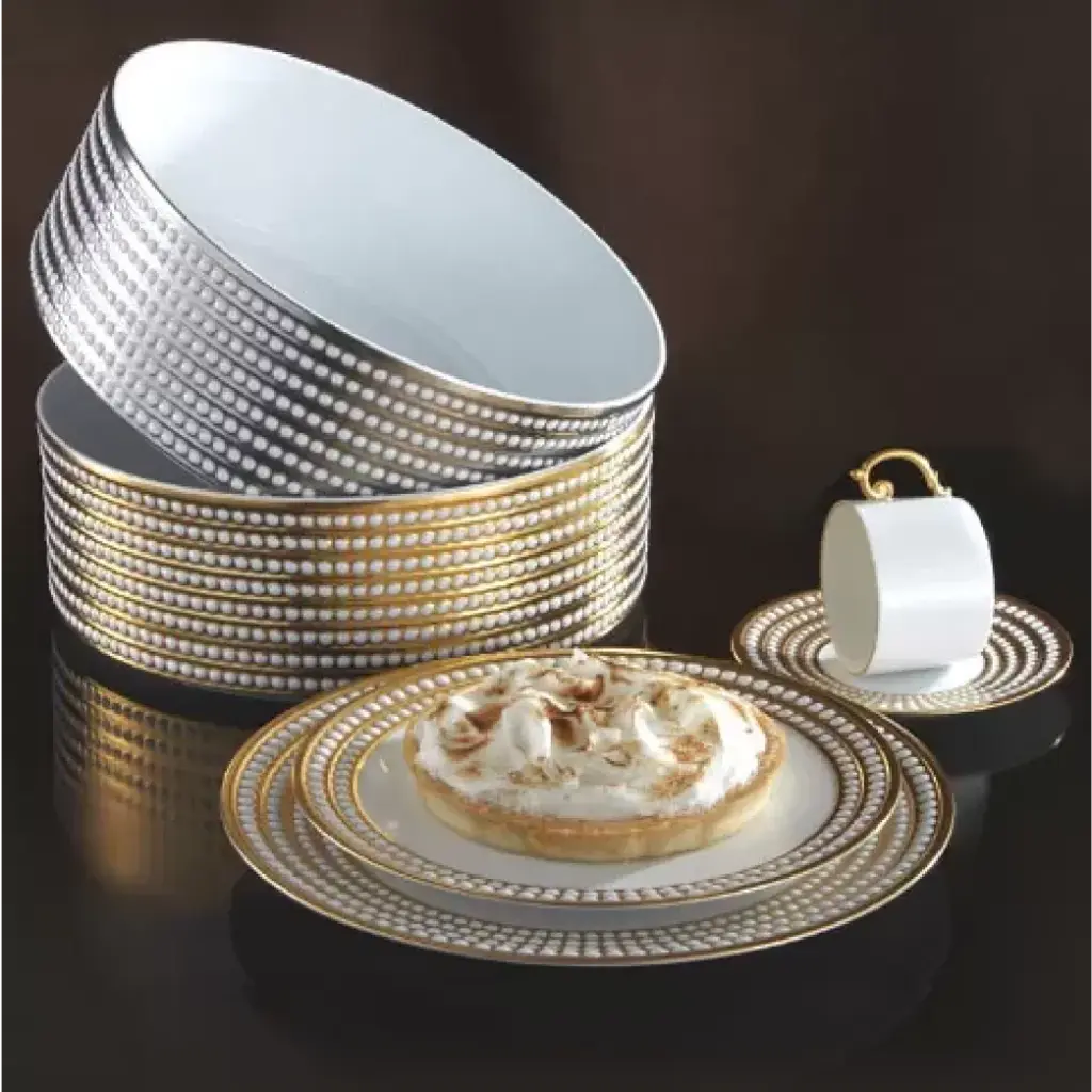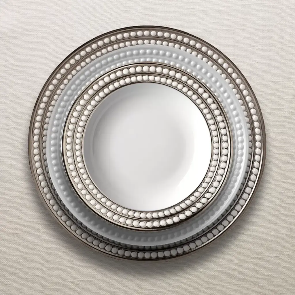 Inspired by the timeless elegance of the pearl, each piece in the Perlee collection is hand-gilded with three layers of 24 kt gold or platinum. Each piece is hand-crafted from Fine porcelain with a raised border of pearl shapes. By L'Objet. Also available in white, gold, and blue. Prior to founding L’Objet in 2004, Israeli-born Elad Yifrach was a successful designer in Beverly Hills. He was creating beautiful interiors, but he was frustrated by the limited options available in home accessories, so he set out to create something better. L’Objet’s collections are diverse, but they are almost always inspired by nature and architecture. Many of his exquisite serving pieces rest in a base of hand-crafted gold foliage, other pieces feature intricate design and beadwork, and some of the most striking objects actually look like miniature buildings. And despite the lux feel, much of the line is practical with just a touch of whimsy.