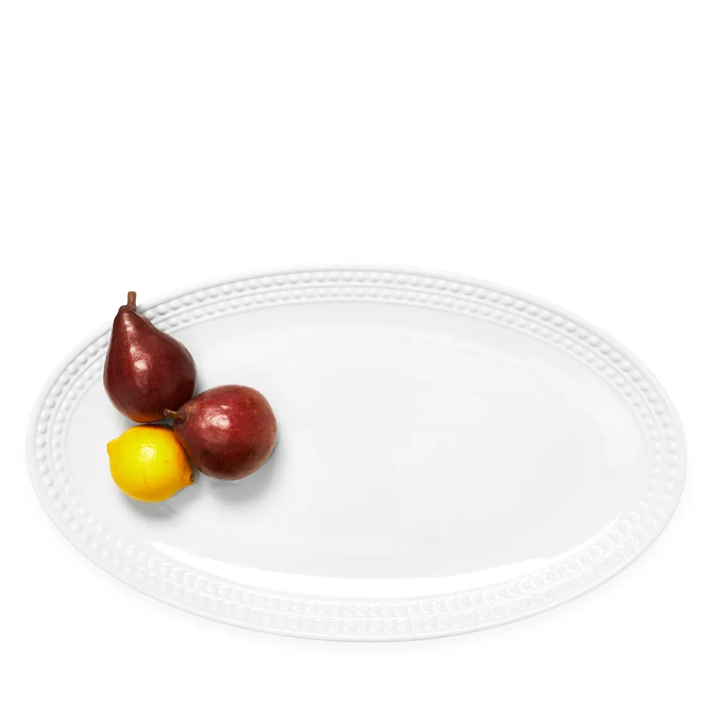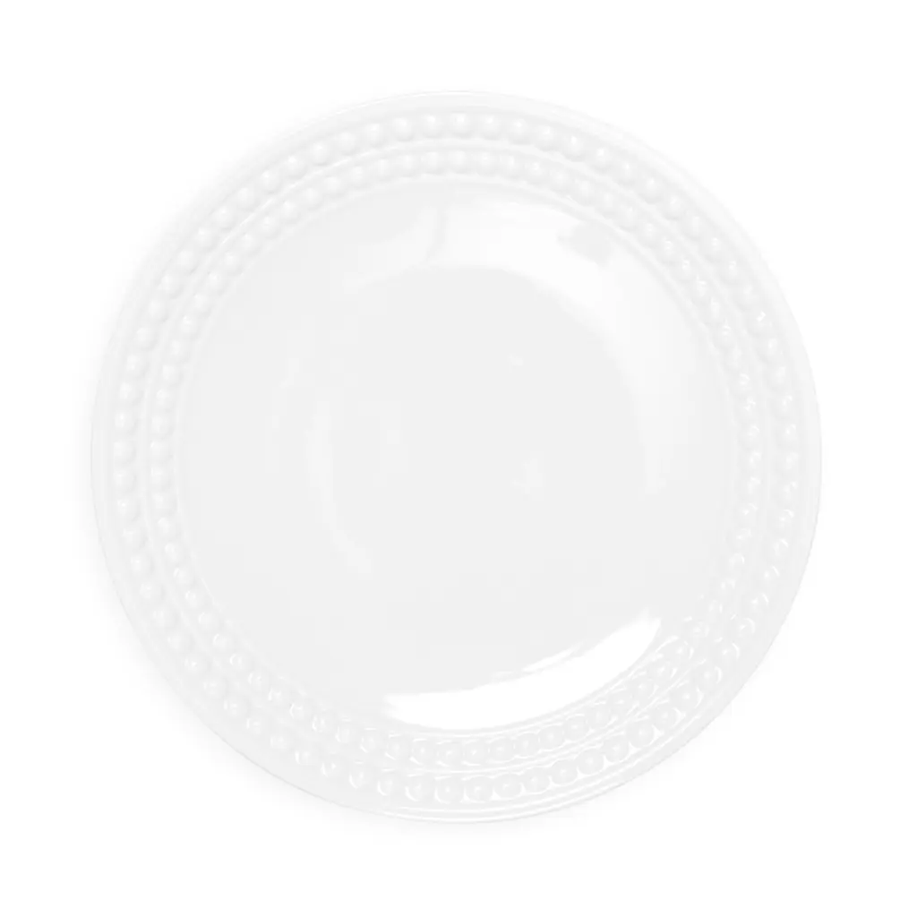 The refined beauty of natural pearls informed this elegant white porcelain dinnerware from L'Objet.