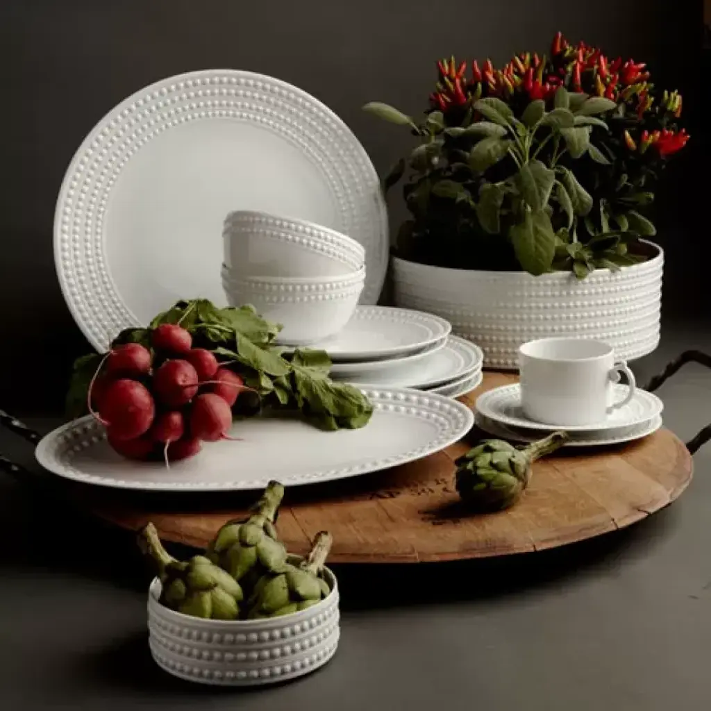 Inspired by the timeless elegance and enduring modernity of the pearl, Perlée is an expression of classic dinnerware. Hand-crafted from solid white Fine porcelain with meticulously hand-painted 24-karat gold or platinum that highlight the individual pearls. Also available in gold, platinum, and blue. Prior to founding L’Objet in 2004, Israeli-born Elad Yifrach was a successful designer in Beverly Hills. He was creating beautiful interiors, but he was frustrated by the limited options available in home accessories, so he set out to create something better. L’Objet’s collections are diverse, but they are almost always inspired by nature and architecture. Many of his exquisite serving pieces rest in a base of hand-crafted gold foliage, other pieces feature intricate design and beadwork, and some of the most striking objects actually look like miniature buildings. And despite the lux feel, much of the line is practical with just a touch of whimsy.