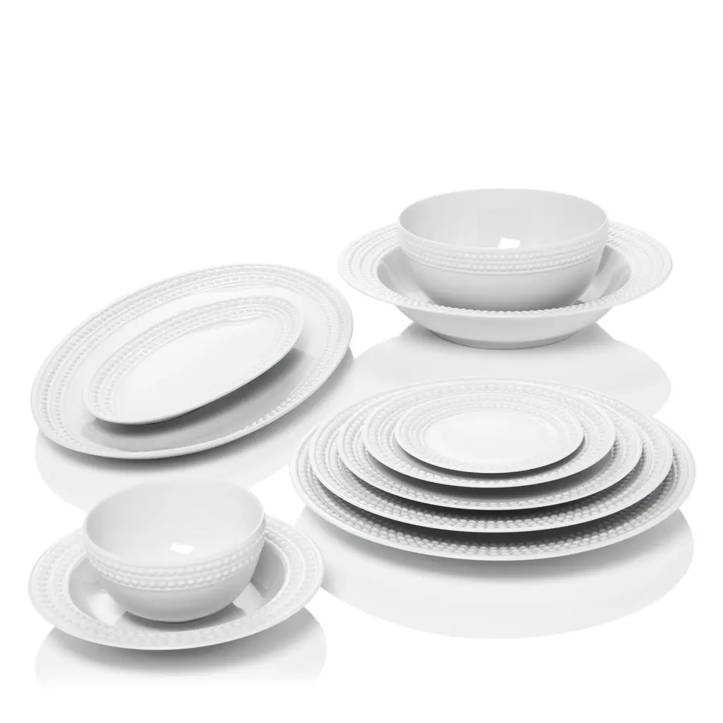 The refined beauty of natural pearls informed this elegant white porcelain dinnerware from L'Objet.
