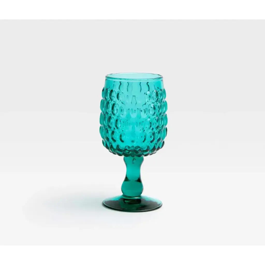 This stem glass set offers an extraordinarily charming shape and accented exterior elevating all of your daily routines. Made from colored glass, this drinking glass offers a transparent silhouette accented by a pattern of dots, resulting in stunning visual shadowplay as light hits every angle. Fun with just the right amount of boldness, these wine glasses are versatile enough for any use or occasion. Set of 4 wine glasses of the same color White dotted pattern Subtle ribbed texture Measures 4"dia x 8.75"H Capacity: 490 ml/ 17.28 oz Dishwasher safe