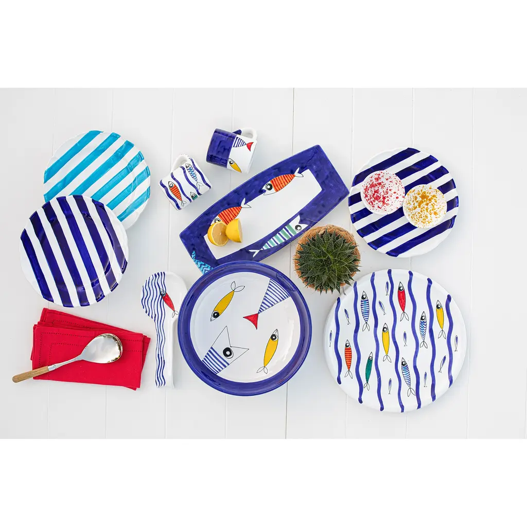 A sophisticated and artistic take on seaside style, VIETRI's Pesce Pazzo collection is both minimalist and whimsical, with a crisp color palette that's as refreshing as a dip in the Mediterranean. Handpainted solid, striped and scaly fish swim across each piece, bringing nature-inspired beauty to your tablescape.
